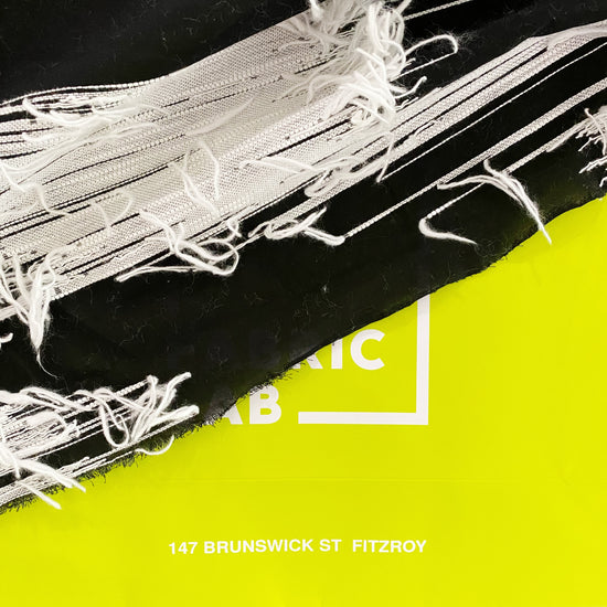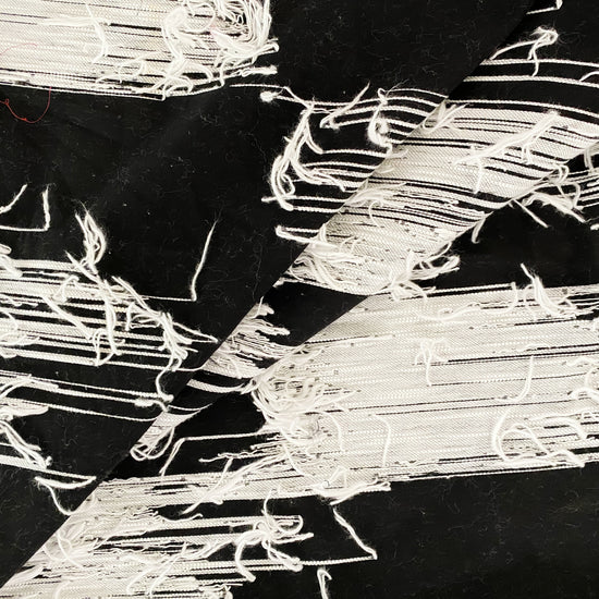 Black semi-sheer textile woven with different weights of white yarn running the weft direction.