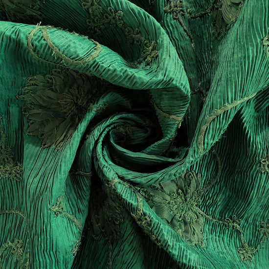 Medium-heavy weight tight plain weave polyester fabric manipulated into wavy corrugated pleats, bonded to a white woven interfacing. A light weight, loose weave fabric in a less saturated, warmer green tone is manipulated into floral and vine shapes and embroidered onto the plisse base with clear filament thread. Opaque coverage with a crumpled crinkly handle, voluminous drape with soft / very little structure, and no give in either direction.