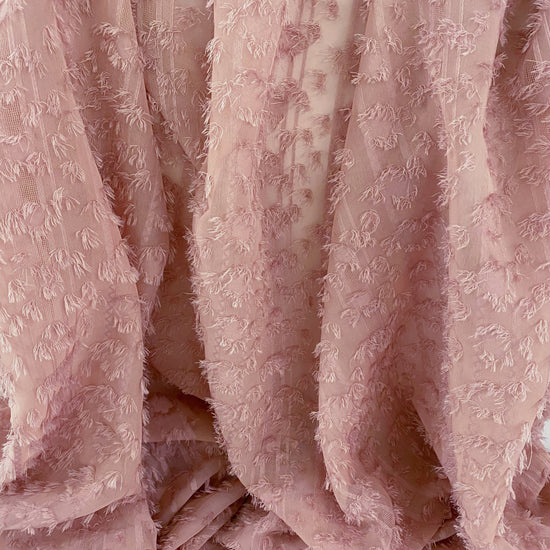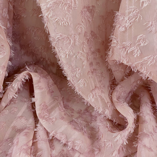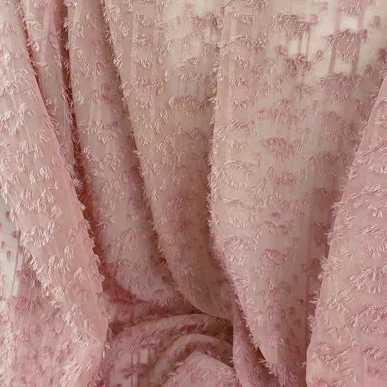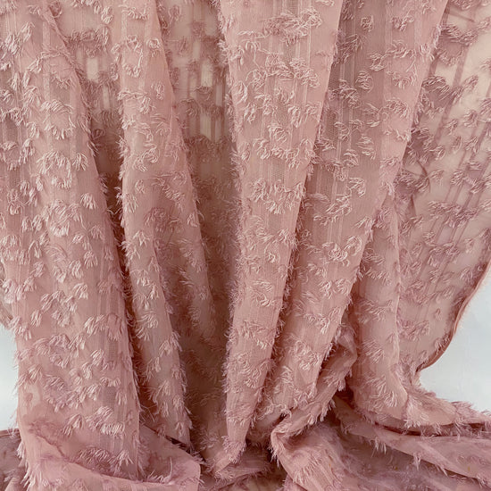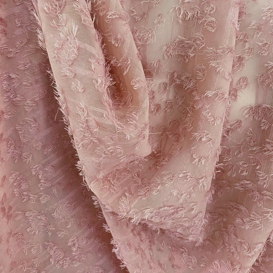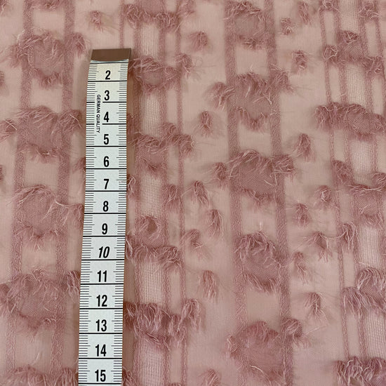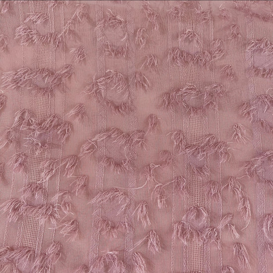 Light weight sheer, striped chiffon with dobby fringing. It has great drape and a soft, lightly textured handle.