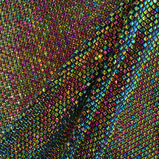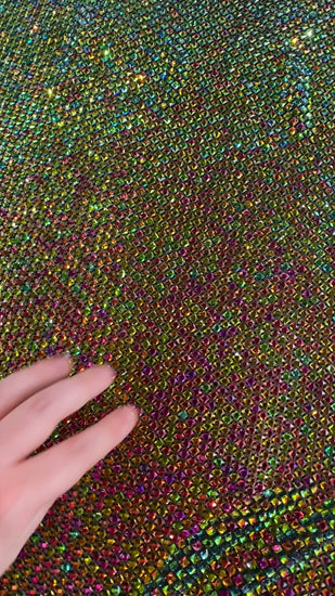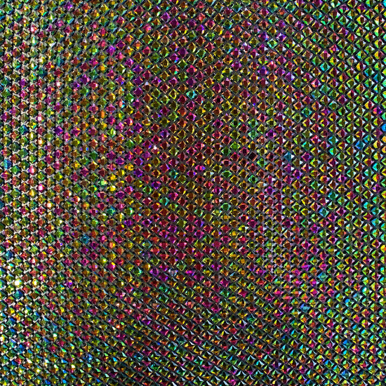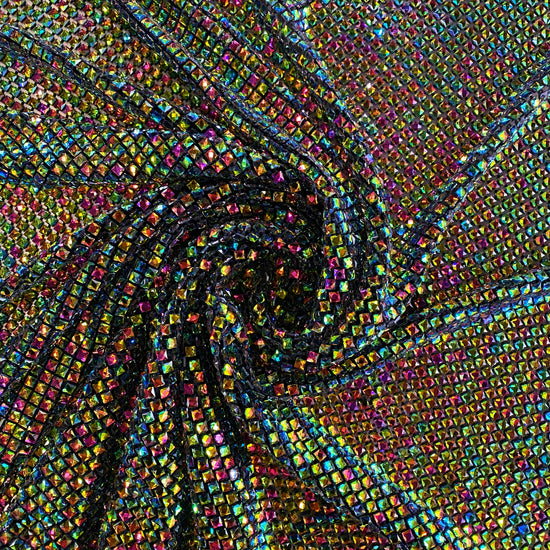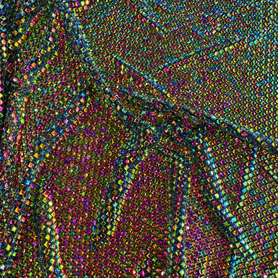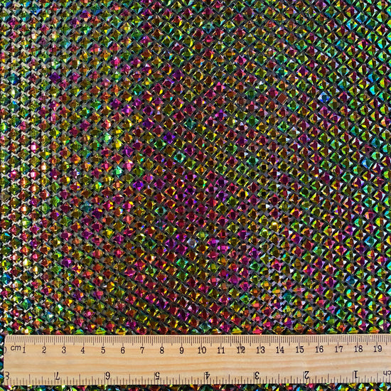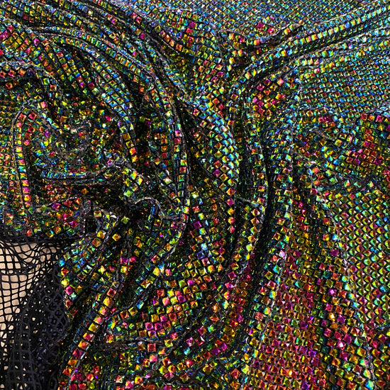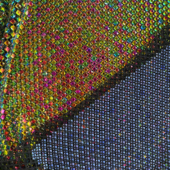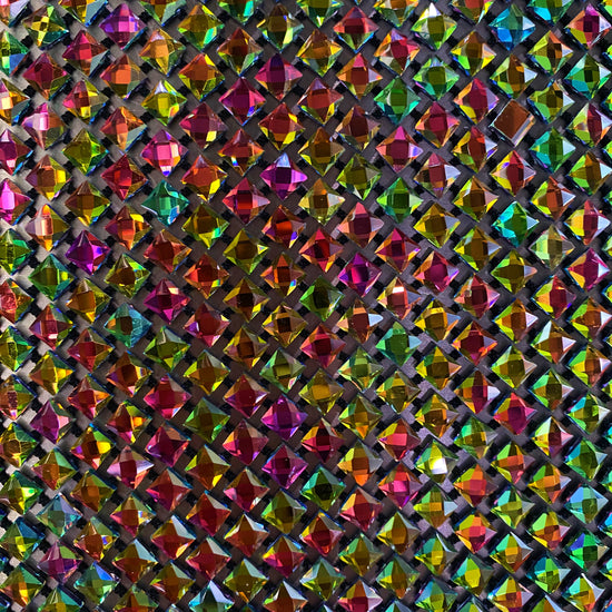 Stretchy polyester fishnet mesh adorned with 5x5mm bevelled square glass rhinestone crystals resembling the shape of princess cut diamonds. Each piece weighs approximately 3-4kg. Two-way stretch.