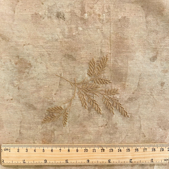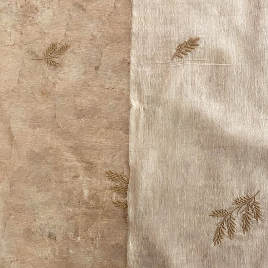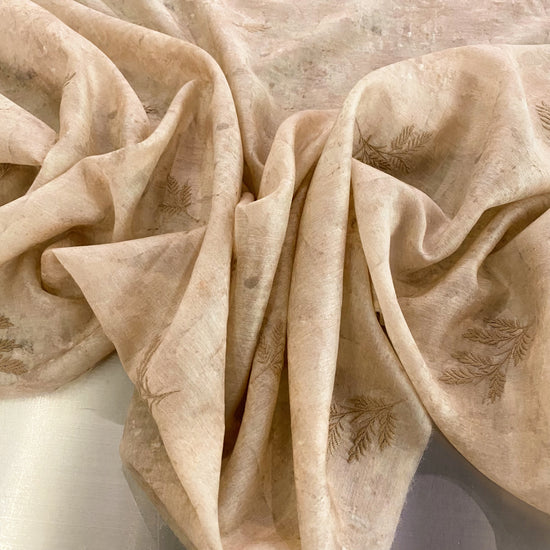 Silk and cotton blend voile with a slightly slubbed weave, digitally printed with a faux botanical dye texture, and machine embroidered with pine needle / leaf and branch motifs. Soft drape, no stretch.