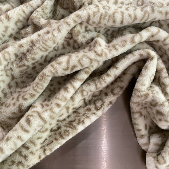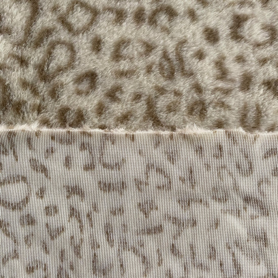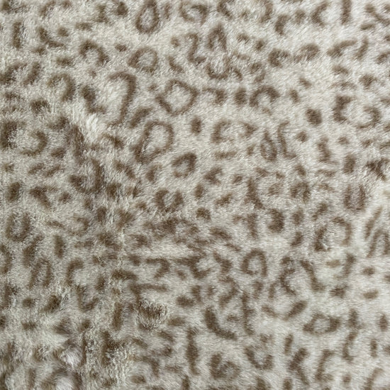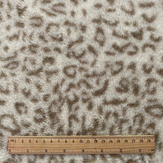 Polyester Faux Fur in White/Olive. This short hair heavyweight faux fur has a tightly knitted backing, a leopard pattern motif, and a plush handle. It has a structured drape, opaque coverage, and no give.