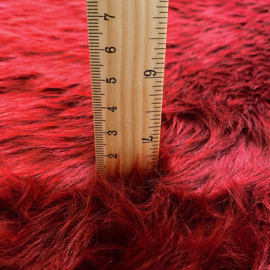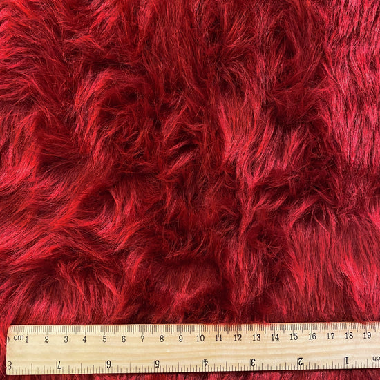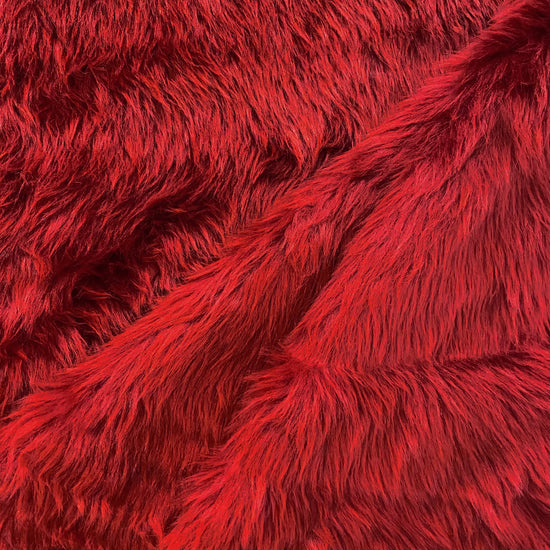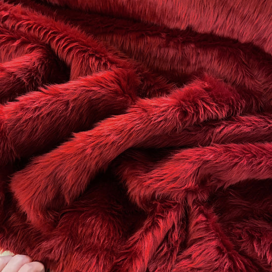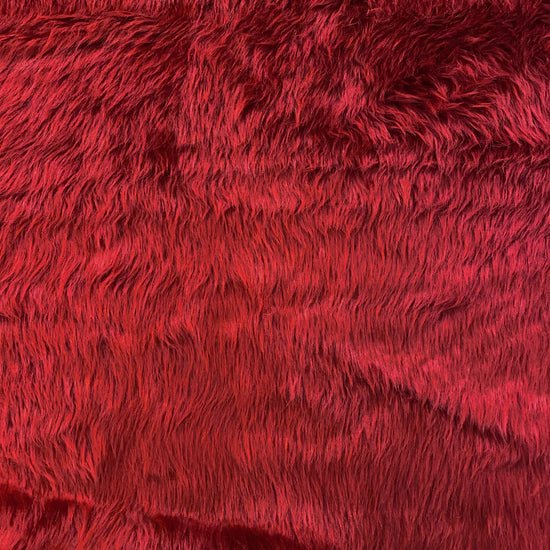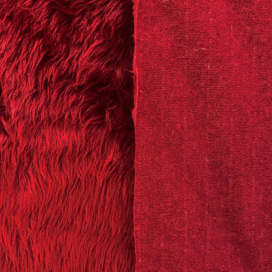 Polyester Faux Fur in Crimson. This heavyweight faux fur has a tightly knitted backing, medium length hair coat with a high-medium sheen, and a plush handle. It has a structured drape, opaque coverage, and no stretch.