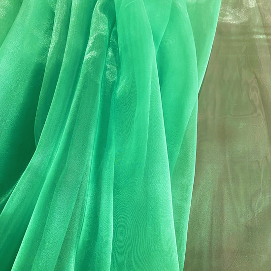 Polyester organza in Lime Green. This lightweight fabric has a fine plain weave with a grainy metallic lustre and a dry handle. It has a structured drape, semi-sheer coverage, and no stretch.