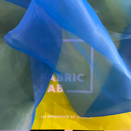 A polyester twill weave organza woven in a dodger blue colour. This lightweight fabric has a flat lustre with a subtle sheen, and a smooth handle. It has an airy drape with a slight bounce, sheer, with no give in either direction.
