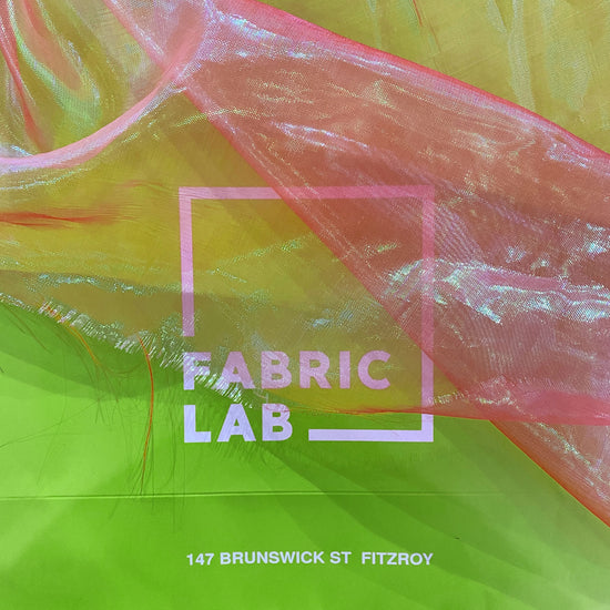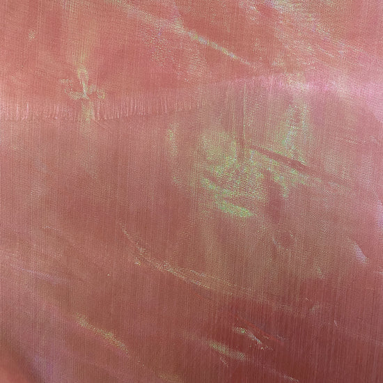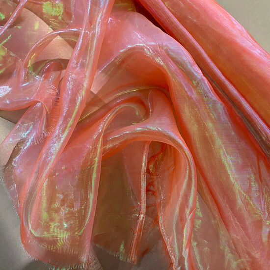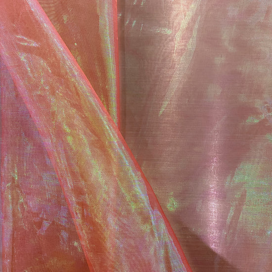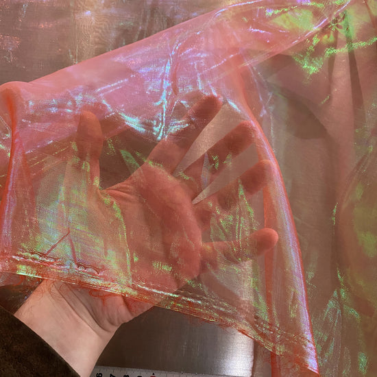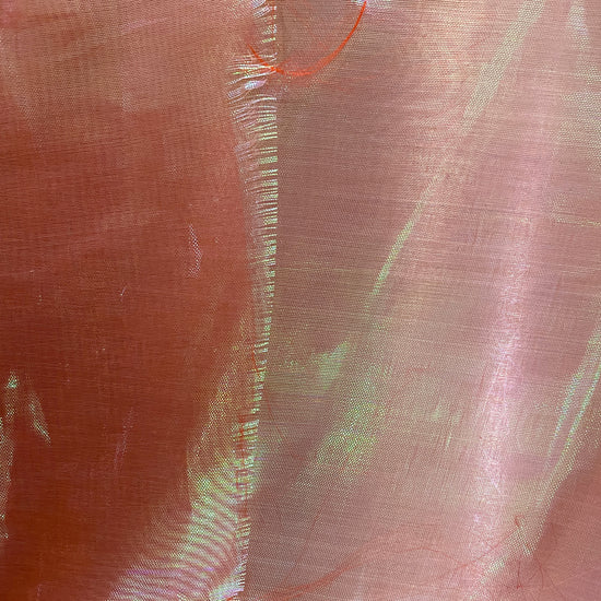 Polyester organza woven with red weft yarn and iridescent warp yarn. This lightweight fabric has a fine plain weave with a dichromatic holographic lustre, and a dry handle. It has a structured drape, semi-sheer coverage, and no stretch.