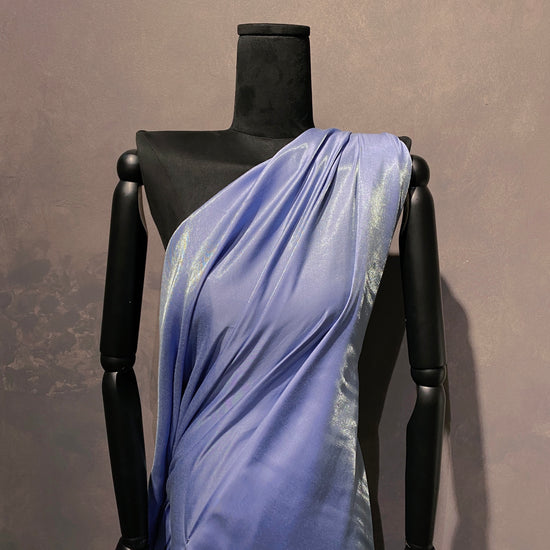 A polyester charmeuse with blue weft yarn, shot with transparent warp yarn in a satin weave structure. Lightweight with a fluid drape, it reflects light in streaks of white with a subtle mint / turquoise tone, while also having a frosted, glazed appearance, cool smooth handle, and no give in either direction. Draping and gathering will best show off the shot appearance of this fabric, or it can be cut on the bias for a more slinky, fitted style.