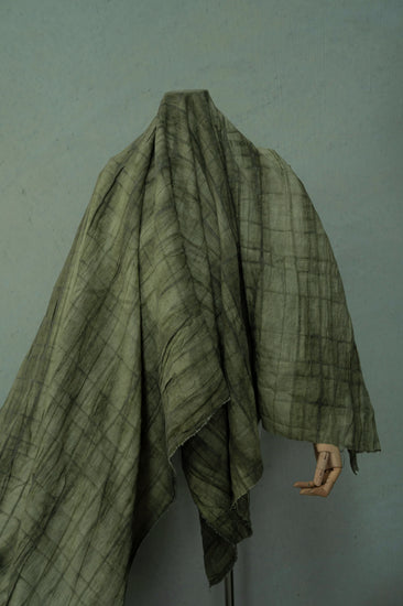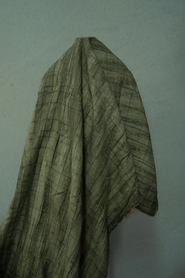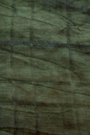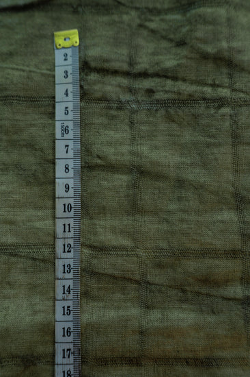 A medium weight, opaque, irregular checkerboard plain weave with open weave stripes, naturally plant dyed with an antique appearance and a little give in the weft direction.