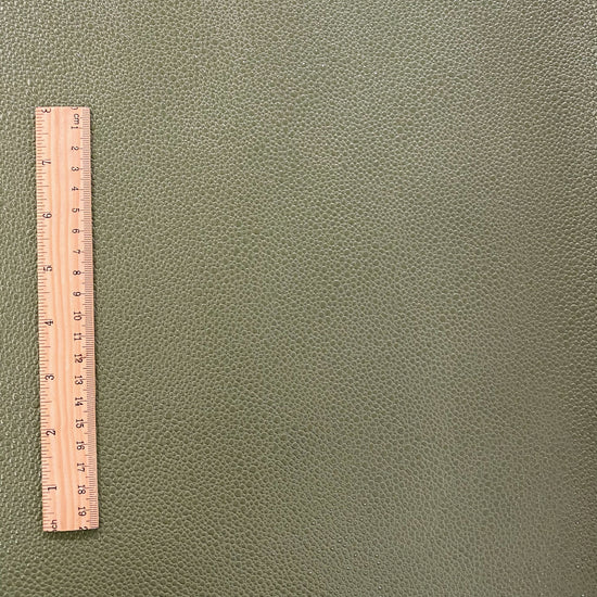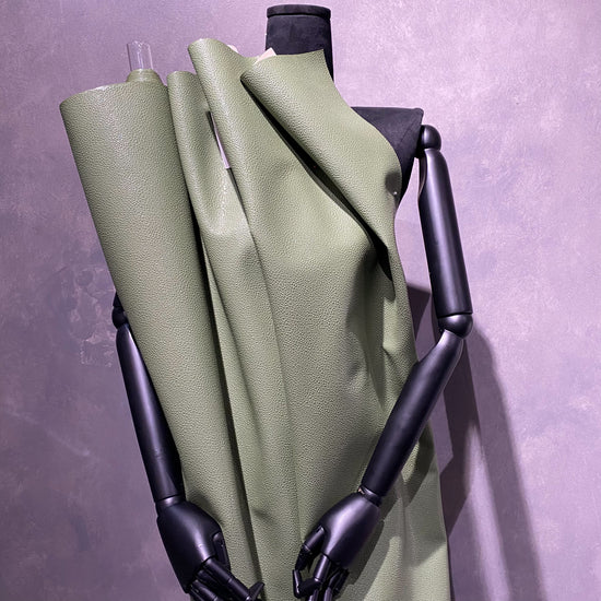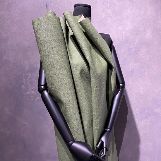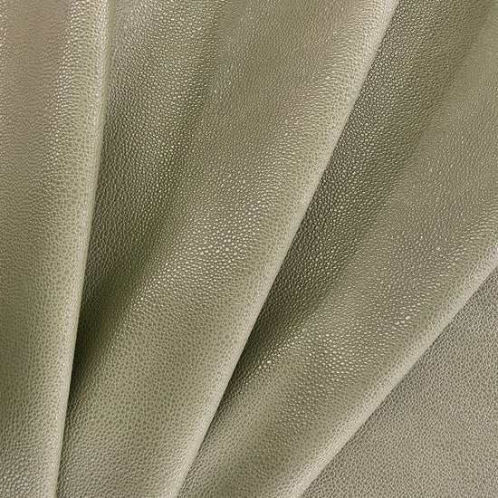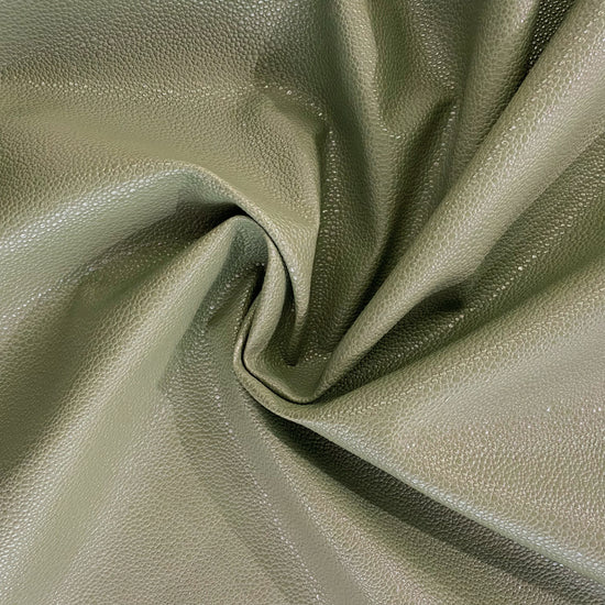 Faux Snake Leather in Sea Green. This heavy weight faux leather has an embossed snake scale motif with a natural sheen. Bonded to a non-woven backing, it has a stiff drape, opaque coverage, and no stretch.