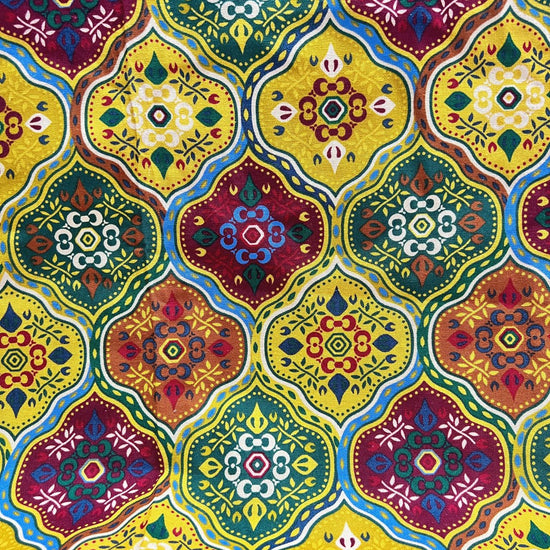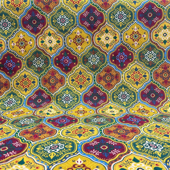 A light weight, opaque, plain weave cotton with Moroccan tile repeat in multiple colours, medium drape and soft, warm handle. Non-stretch.