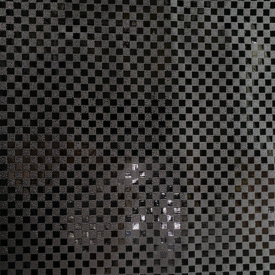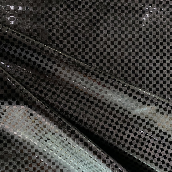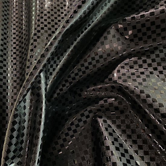 Patent Checkerboard Faux Leather in Black. This heavy weight faux leather has an embossed chockerboard motif with a glossy patent finish. Bonded to a non-woven backing, it has a stiff drape, opaque coverage, and no stretch.