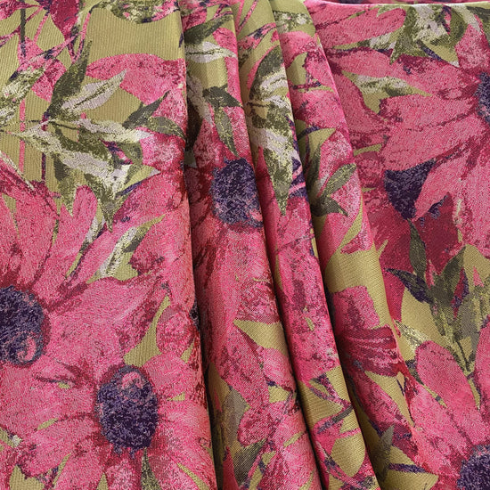 A medium weight, opaque jacquard with no give. It has a grainy textured handle, matte, large floral appearance and minimal, structured drape.