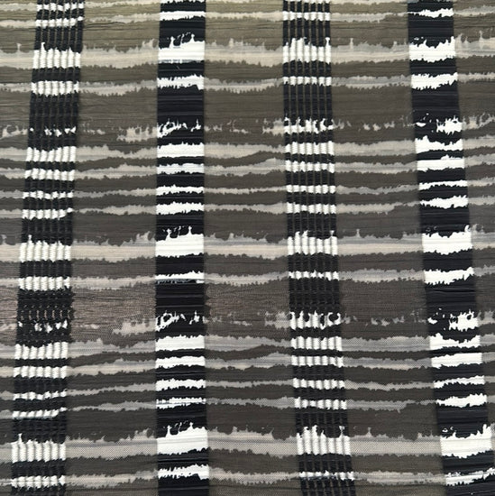 A light weight, sheer warp knit (net) with stretch in the warp direction and some give in the weft direction. It has slightly rough, textured handle, semi-matte appearance and soft drape.