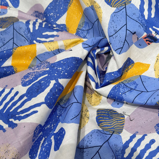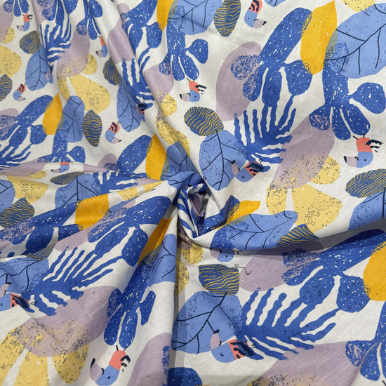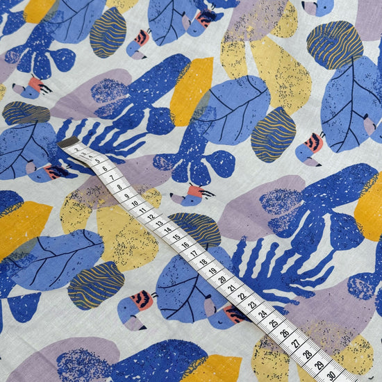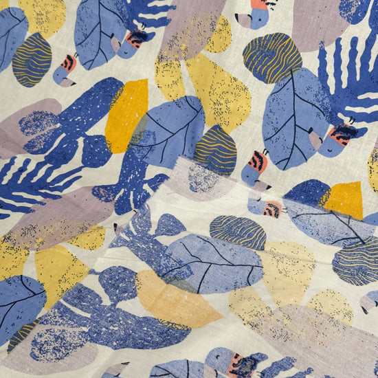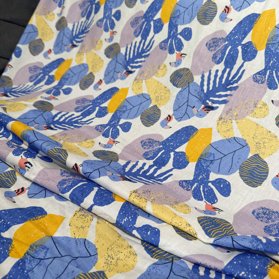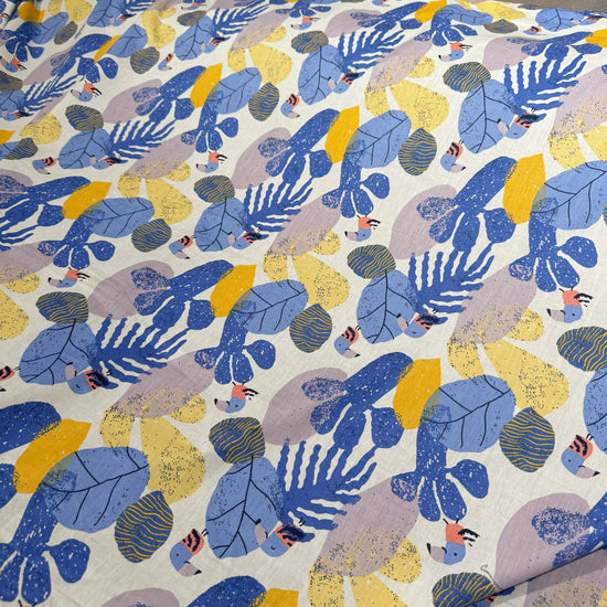Birds & Leaves Storybook Illustration Cotton Lawn - Cornflower/Gold