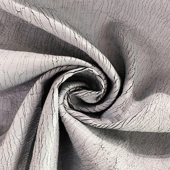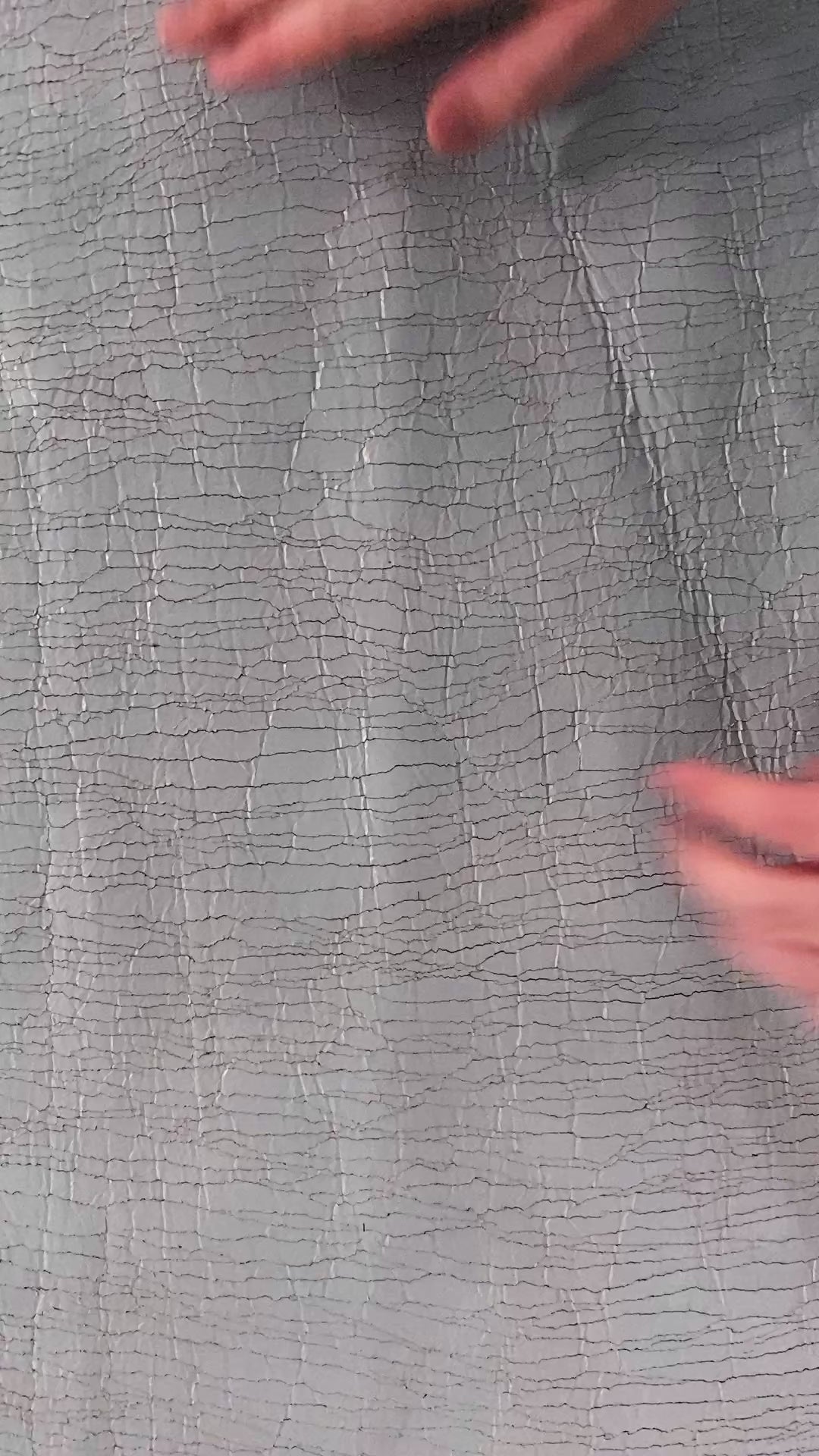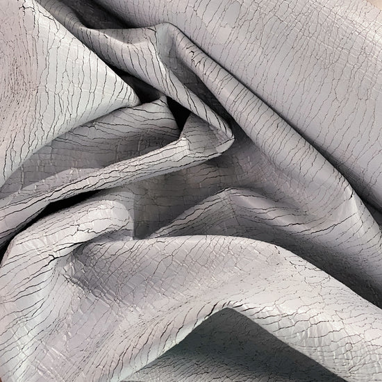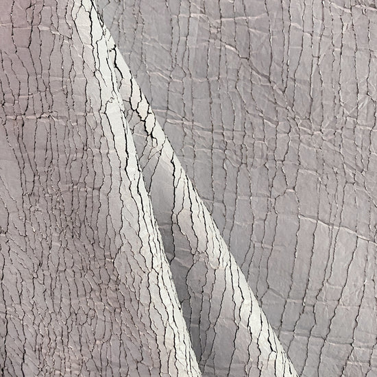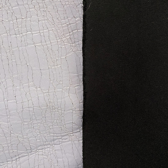 A polyester jersey knit fabric with a knit bonded fusible interfacing, coated on the technical face with a thick paint-like cracked film. The cracked paint surface does not peel or flake off, and does not stretch with the knit structure underneath - so when stretching the fabric, the crevasses between the paint cracks will expand larger and contract. The breathing movement of these paint cracks is best utilised in a fitted garment like a jacket or shorts, something that will bend, stretch and move under tension.