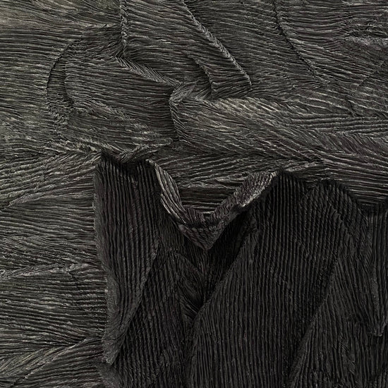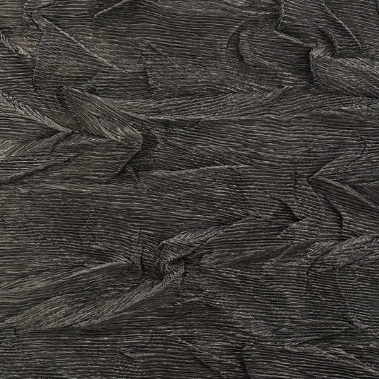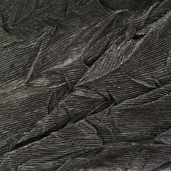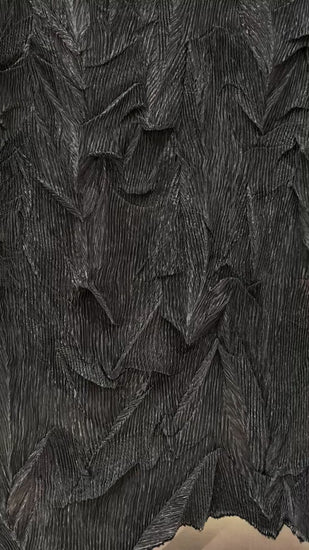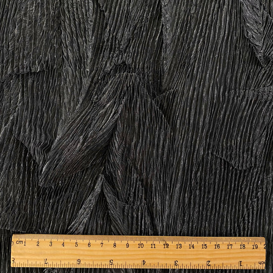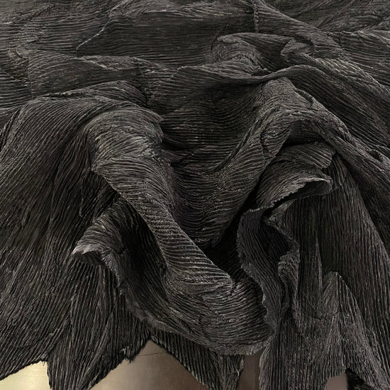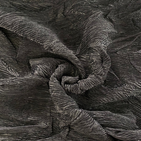 A polyester organza with a shimmery metallic lustre that is pleated into a tight corrugated arrangement parallel to the weft direction, with diamond shaped pleats throughout the fabric creating jagged 3D spikes. Bouncy drape with slight structure. The organza is woven with steel blue and dark grey yarn giving a subtle shot look - making the reverse side of the fabric a darker shade of grey.