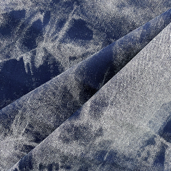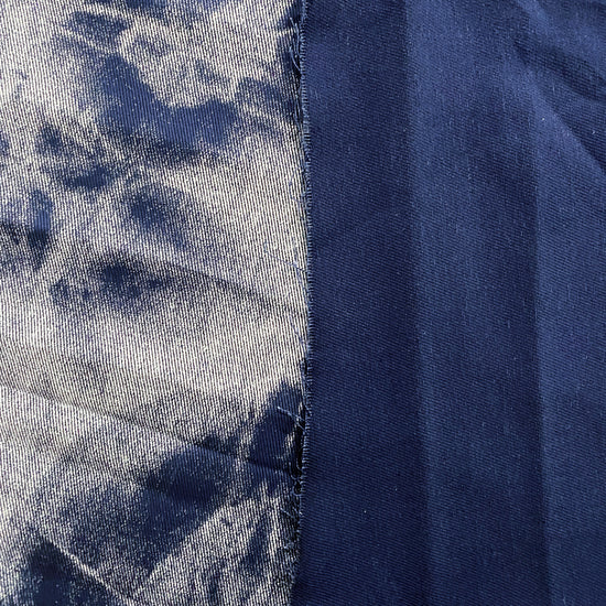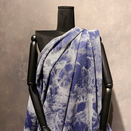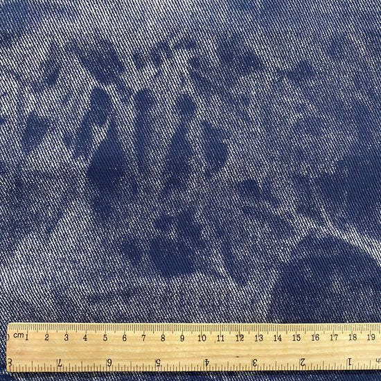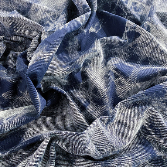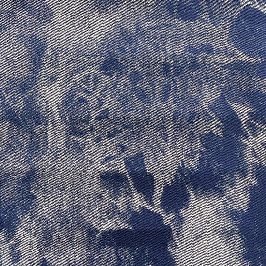 A blue polyester denim weave fabric screen printed with white ink in a marbled tie-dye pattern. Heavy weight with a slightly structured handle, opaque with a waxy handle, slight give in the weft direction and no give in the warp direction.
