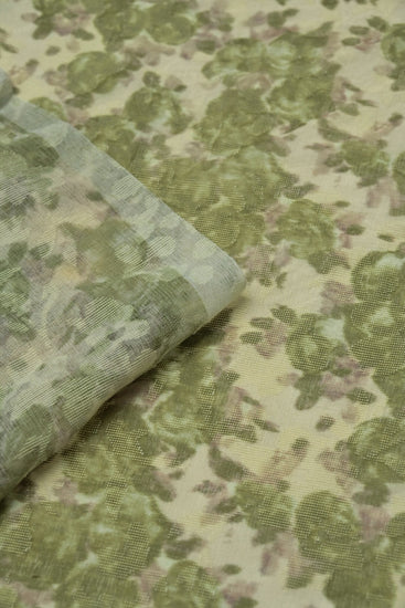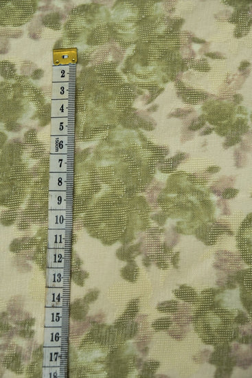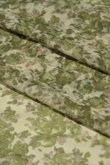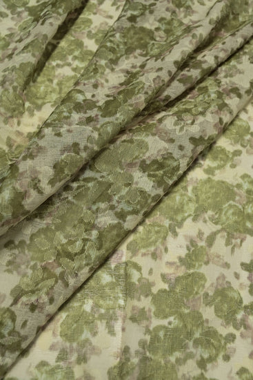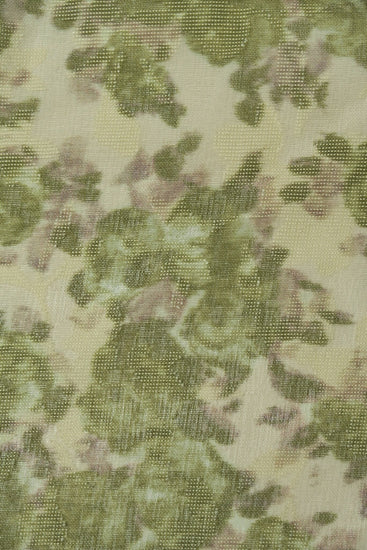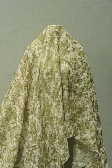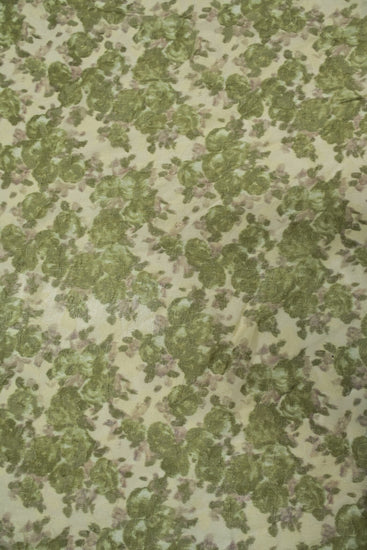 A light to medium weight, sheer, no give, printed plain weave with simple floral inserts, grainy handle, matte, mottled camouflage appearance and some drape.