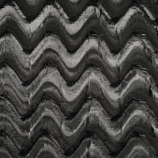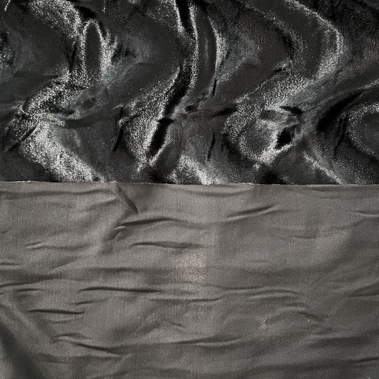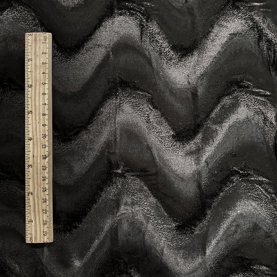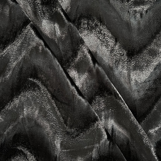 A polyester spandex knit with a plush velvet face, heated and brushed in a wavy stripe pattern, flattening and redirecting the velvet pile creating a difference in the reflective appearance of the fabric. Medium to heavy weight with a fluid drape, soft handle and a good amount of stretch in both directions.