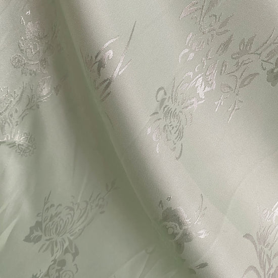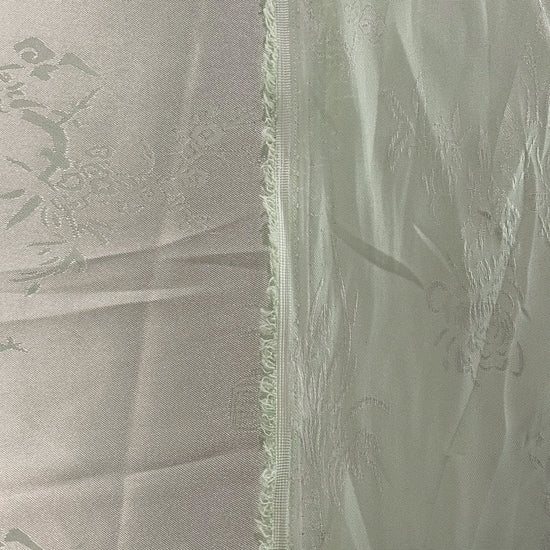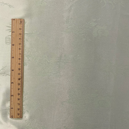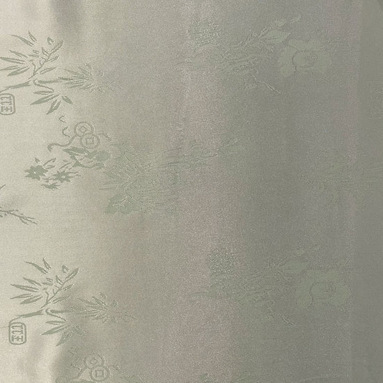 Silk-polyester blend satin jacquard in Pale Green. This lightweight fabric has a tight satin jacquard weave with satin bamboo motifs, and a smooth handle. It has a fluid drape, opaque coverage, and slight ease (of stretch) across the selvedge.