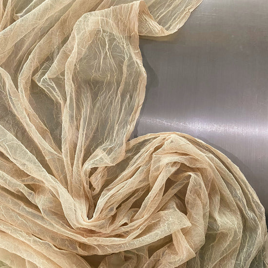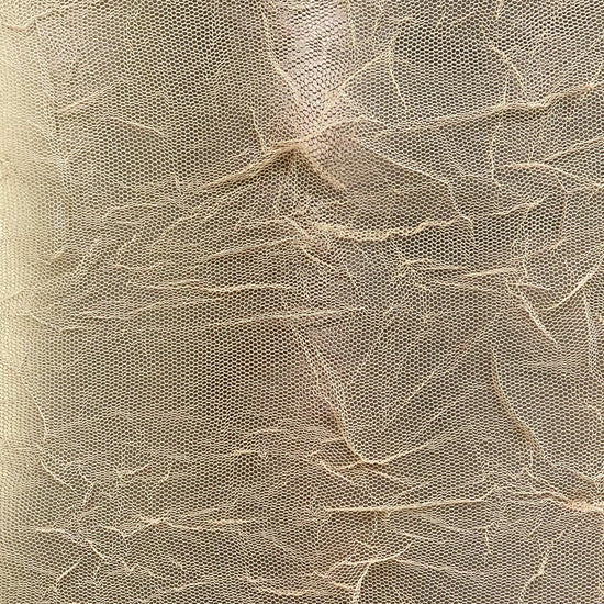 Polyester warp-knit mesh in beige. This lightweight fabric has a loose warp-knit mesh, with a fine puckered finish and a cool handle. It has a fluid drape, sheer coverage, and high dimensional stretch.