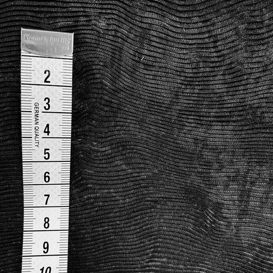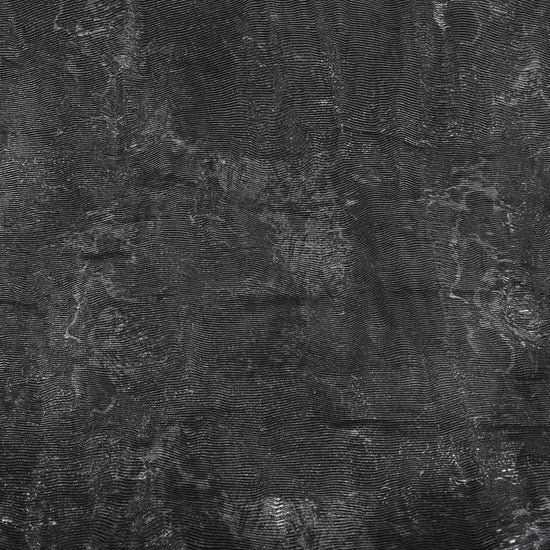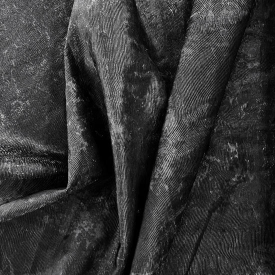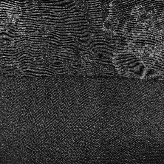 It’s a light-to-medium weight bonded wave plissé fabric with moderate drape. This fabric is opaque with shibori-dyed uneven print running throughout and has no stretch to it due to the bonding. It’s black with dark navy shibori-like print.