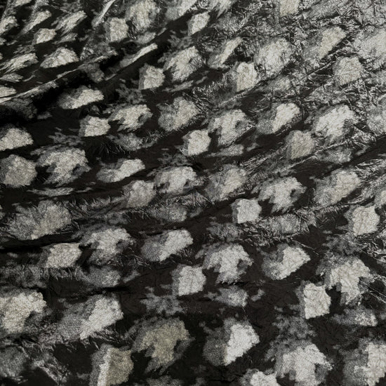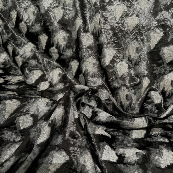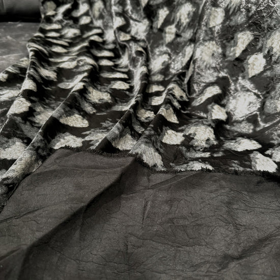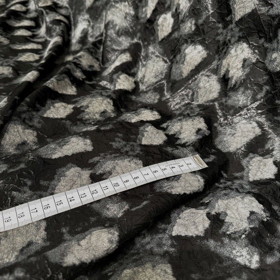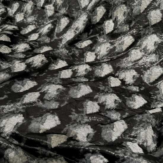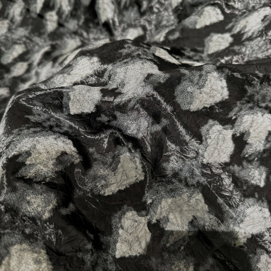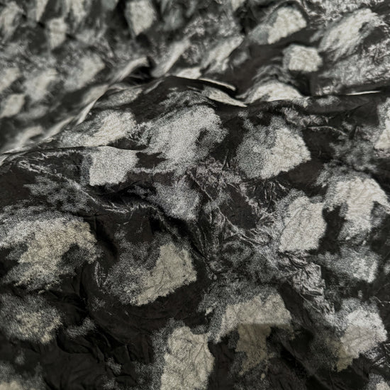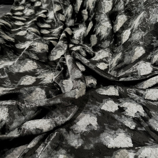 A light to medium weight, opaque, semi-shiny, crinkled satin, with cool, soft rustle handle and structured drape. Finished with an abstract leaf pattern. Non-stretch.