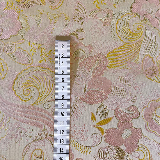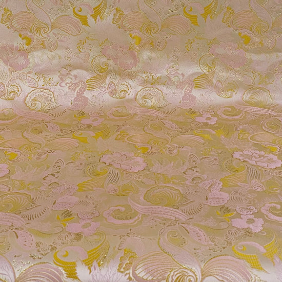 Polyester-blend satin jacquard in Gold/Mustard/Pale Pink. This medium-weight jacquard has a fine satin structure with ornate floral motifs, metallic accents, and a smooth handle. It has a structured drape, opaque coverage, and no stretch.
