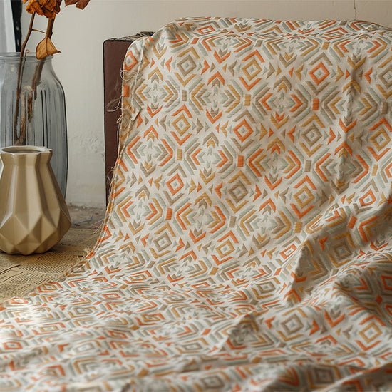 Polyester satin jacquard in Silver/Orange/Baby Blue/Olive. This medium weight fabric has a tight satin jacquard structure with a raised geometric motif. It has a structured drape, opaque coverage, and no stretch.