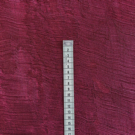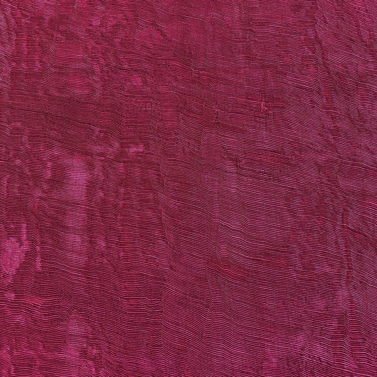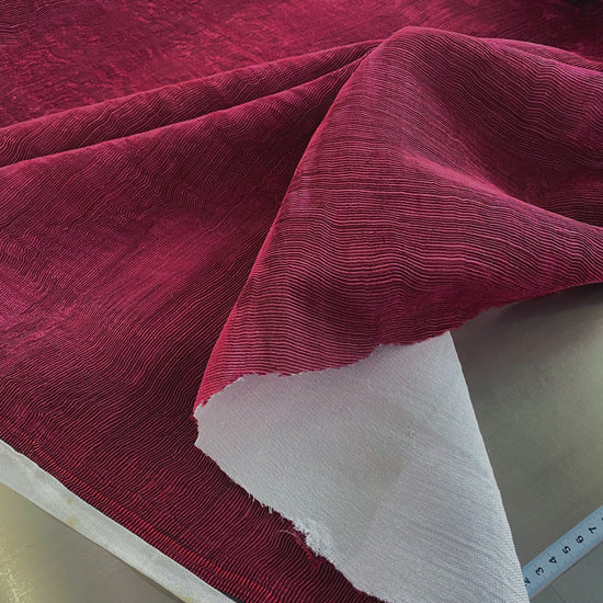 This medium-heavy weight organza has a loose weave, metallic lustre, and a fine corrugated handle. It has a structural drape, opaque coverage, and slight give in the warp direction.