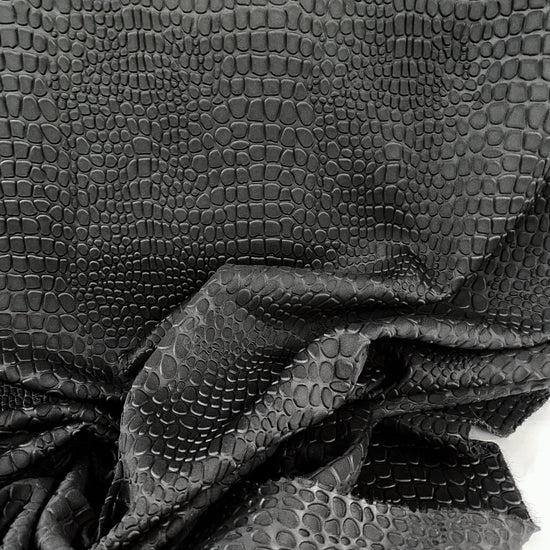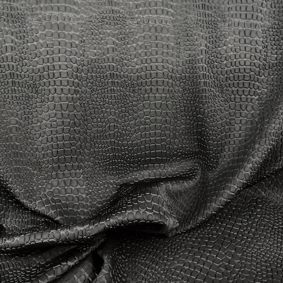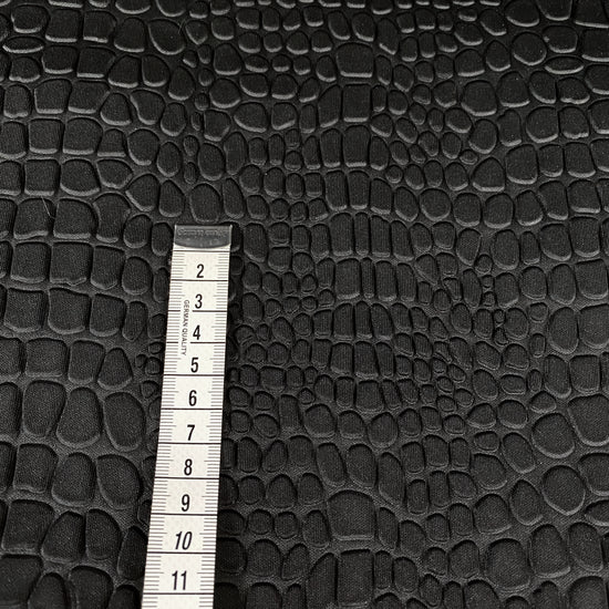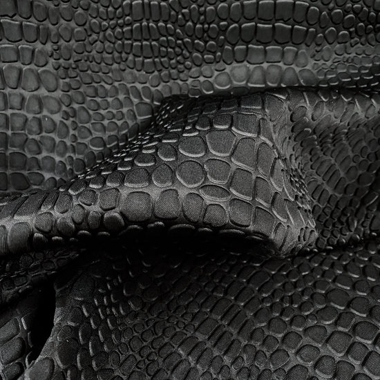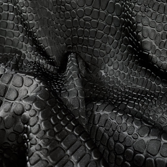 A medium weight, opaque, embossed crocodile print double knit with stretch in both directions, (a little more in the weft direction) good, structured drape and textured handle.