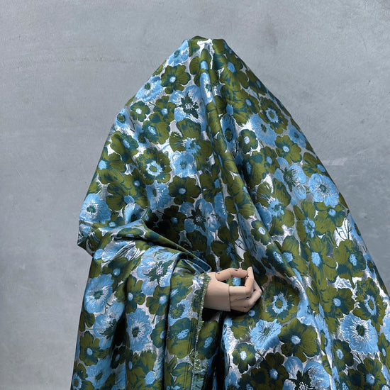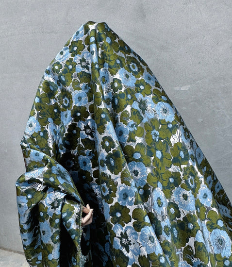 Polyester blend brocade in Moss Green/Dark Olive/Cadet Blue/Silver. This Heavyweight brocade features daisy motifs, woven on a metallic base with a smooth handle. It has a structured drape, opaque coverage, and no stretch.