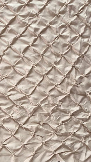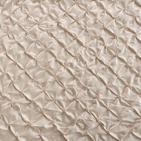 A medium weight, opaque satin with a semi-shiny, glossy appearance. The fabric has a cool, slinky handle, heavy, fluid drape. There are smocked dots throughout the fabric (ending 5cm from the selvedge) pulling the fabric into loose gathers forming a diamond pattern. There is some give in both directions due to the smocking effect, but otherwise no stretch inherent to the fabric.