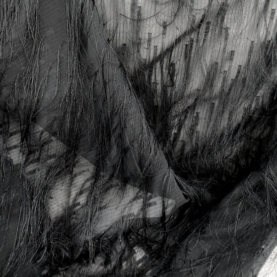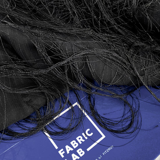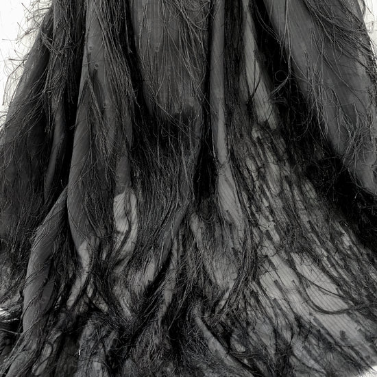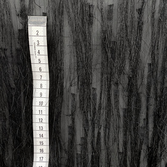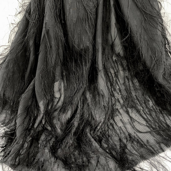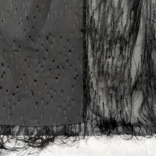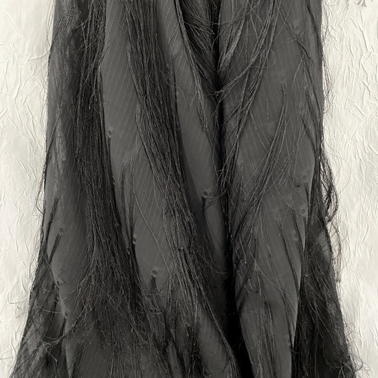 Light weight chiffon with dobby weave long tassels, good drape and a grassy handle and appearance.