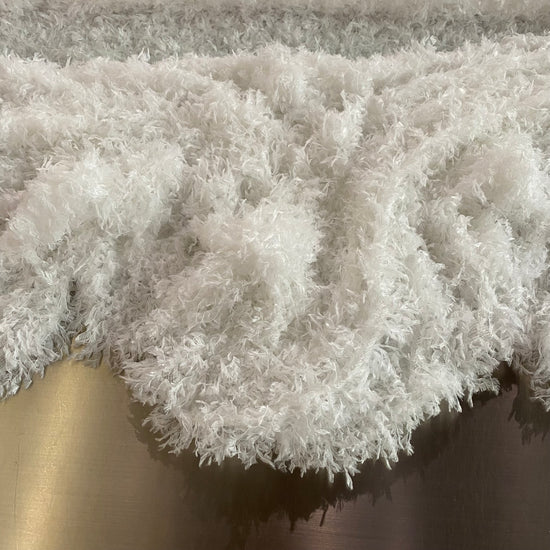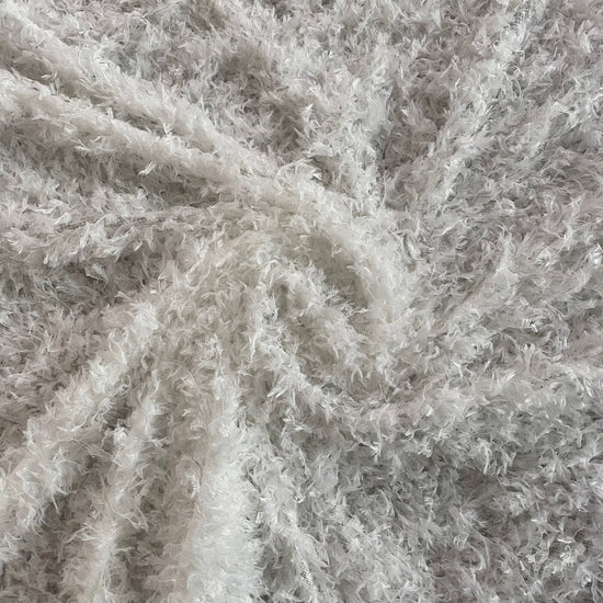 A light weight, semi-sheer, cut-pile warp knit, faux ostrich feather fur with great drape, stretch in the weft direction, and a soft, fluffy handle.