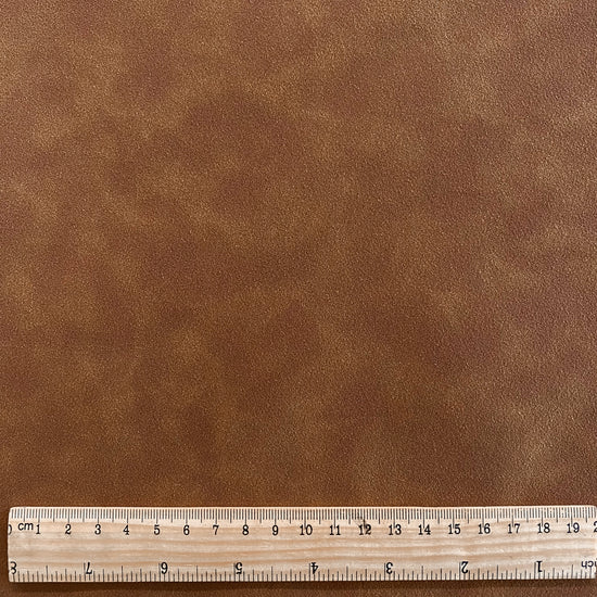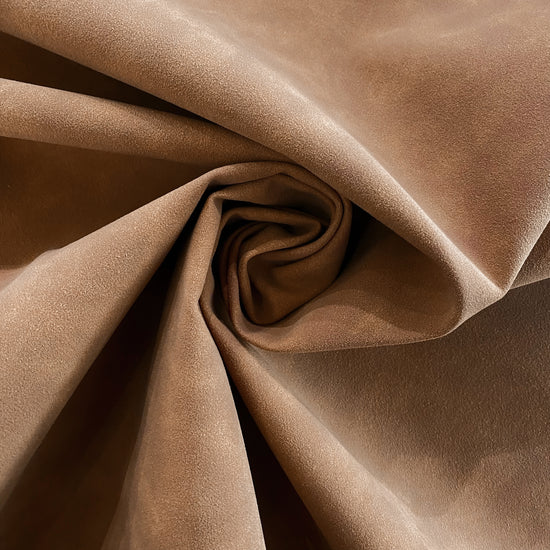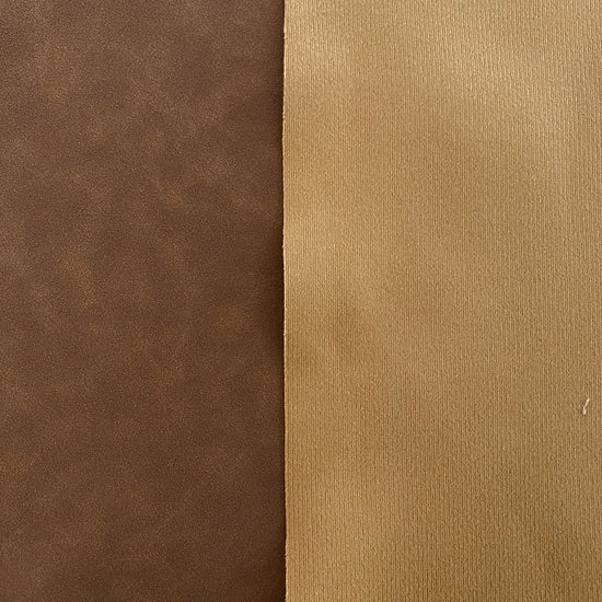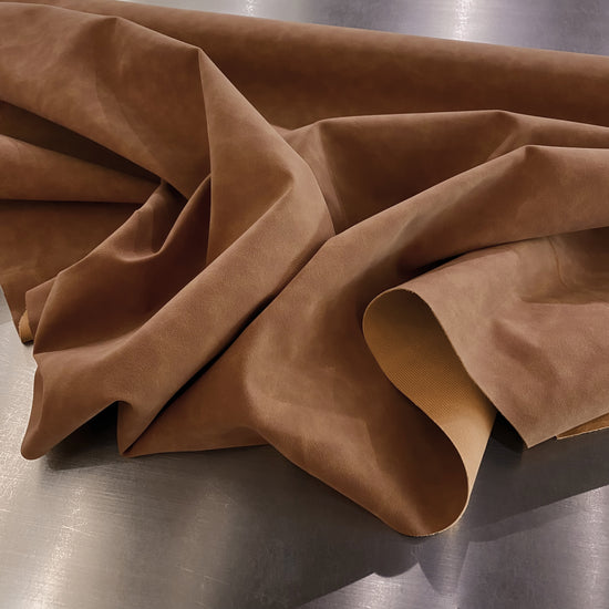 A polyester knit with a coated faux suede finish. This heavy weight fabric is a ribbed knit structure, visible on the back, with a lightly napped top layer finish. Heavy weight with a stiff structured drape and slight stretch in the weft direction.