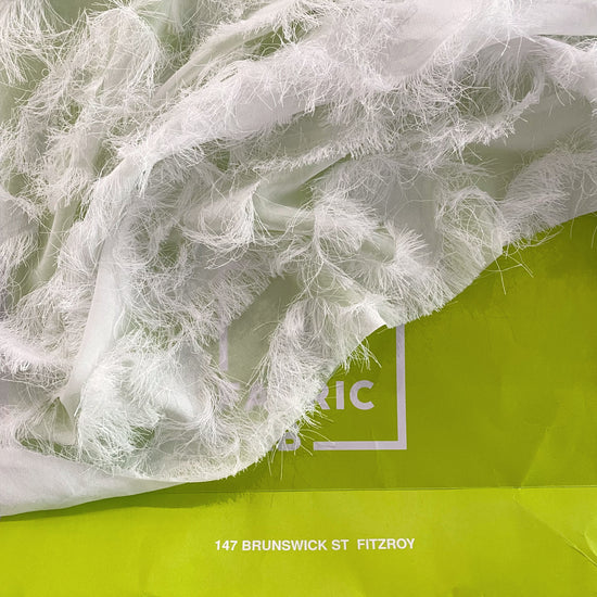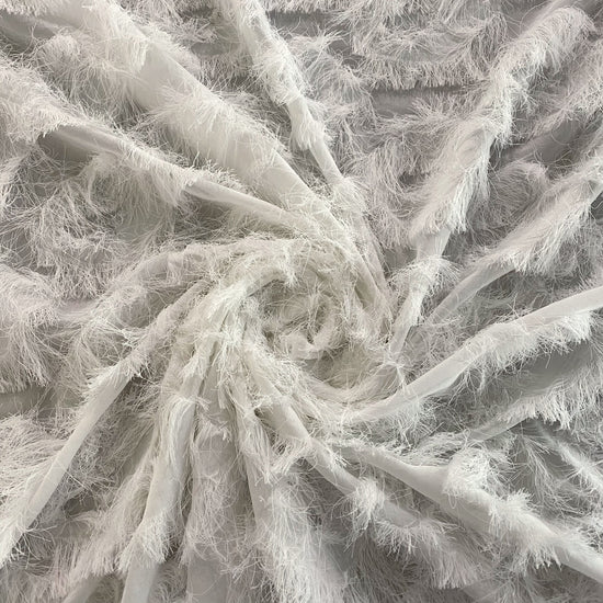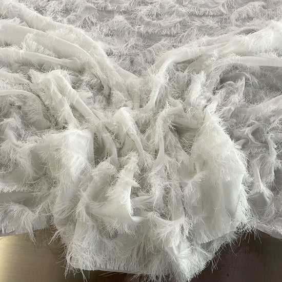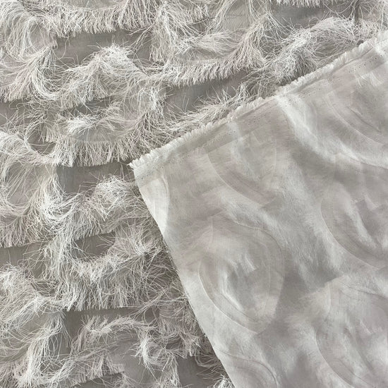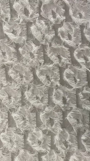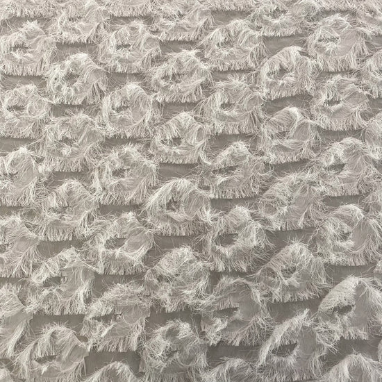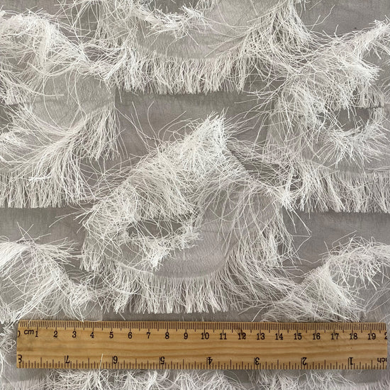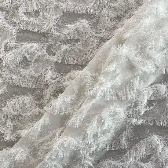 Fringed polyester gauze in White. This light-medium weight fabric has a loose gauze weave with fringed inserts. It has a soft drape, semi-sheer coverage, and no stretch.