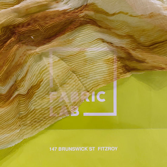 A very light weight, sheer, chiffon plisse with an ombré flame border print, great drape, crinkly textured handle, a lot of stretch in the weft direction due to the pleating and moderate stretch in warp direction.