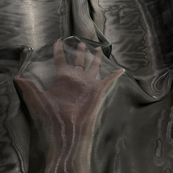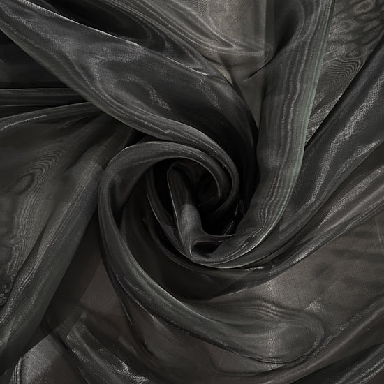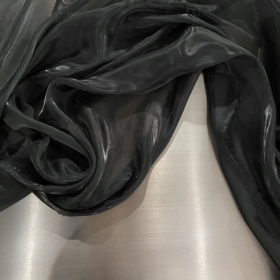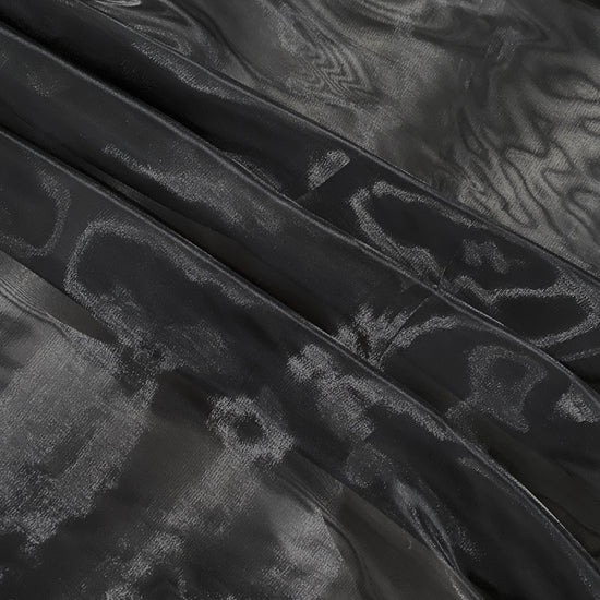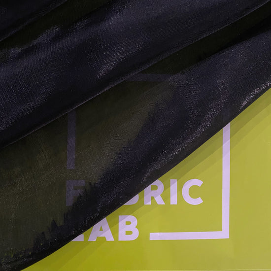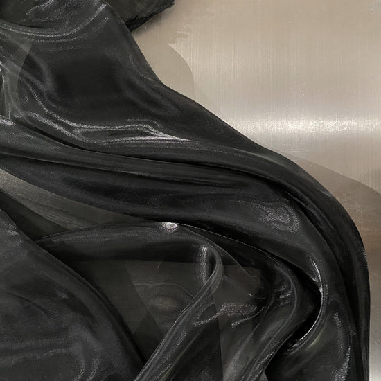 Polyester organza in Black. This lightweight fabric has a fine plain weave with a metallic warp; creating a liquid shimmering lustre with a smooth handle. It has a structured drape with a bounce, semi-sheer coverage, and no stretch.