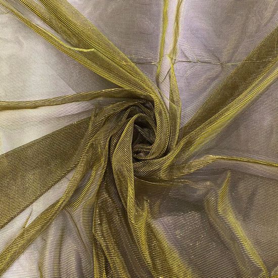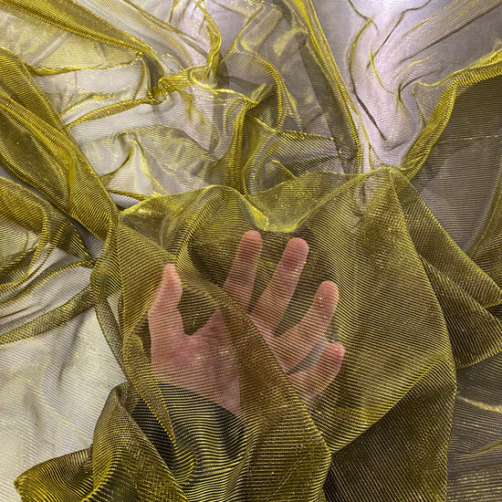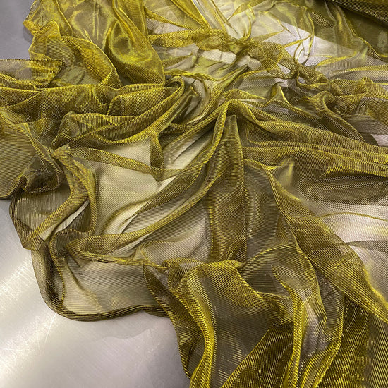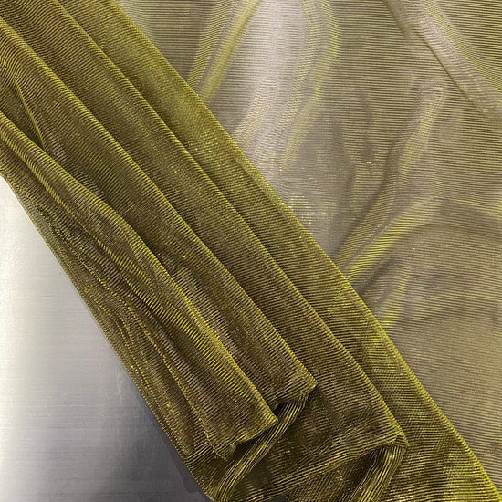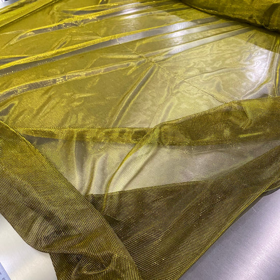 Polyester raschel knit in Gold. This light weight fabric has a loose raschel structure, with a ribbed handle and metallic dichromatic sheen. It has a fluid drape, sheer coverage, and stretches across the salvage.