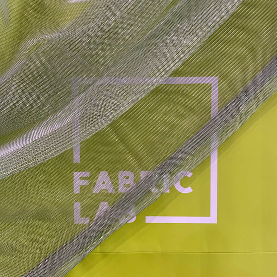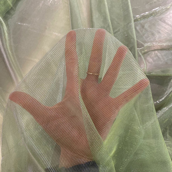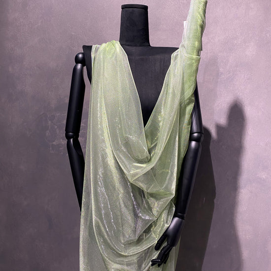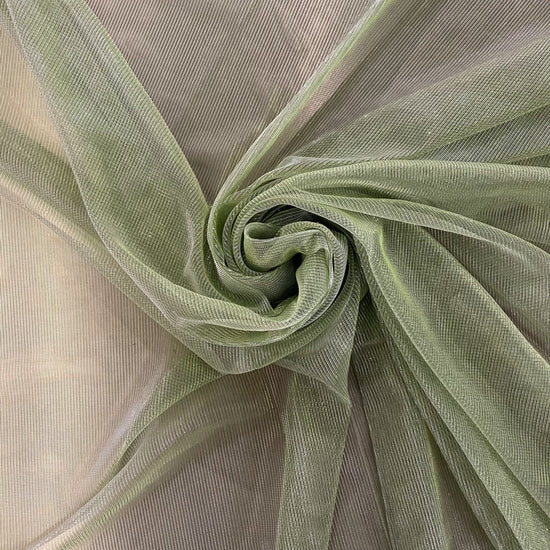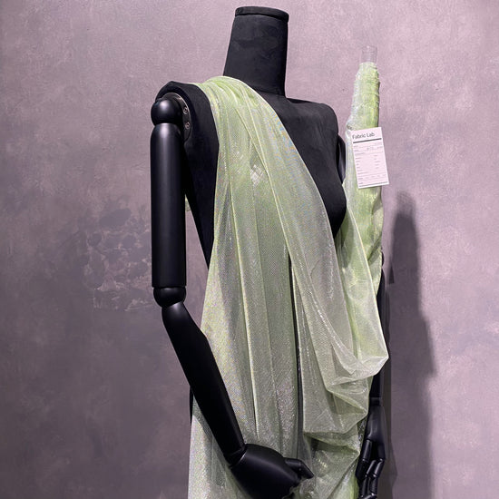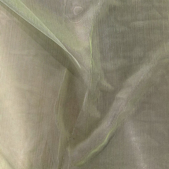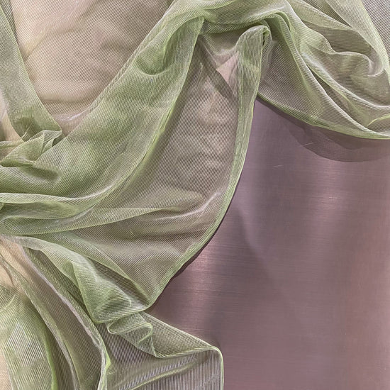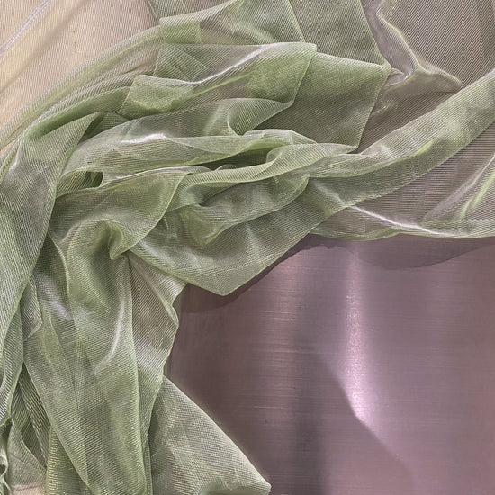 Polyester raschel knit in Pale Green. This light weight fabric has a loose raschel structure, with a ribbed handle and metallic dichromatic sheen. It has a fluid drape, sheer coverage, and stretches across the salvage.