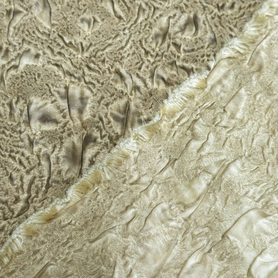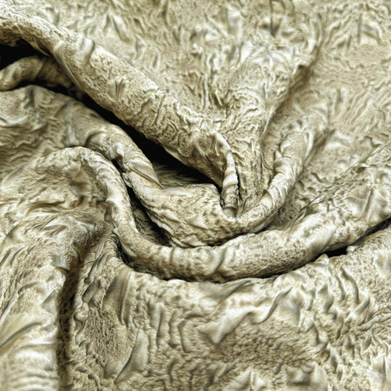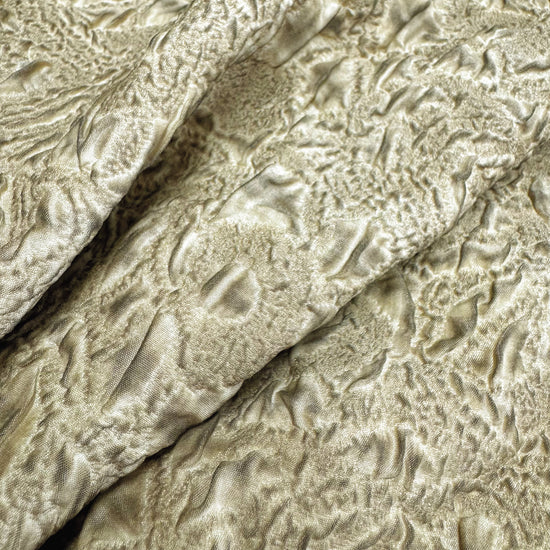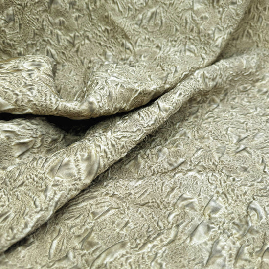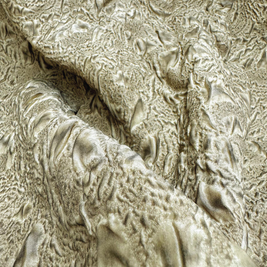 A light to medium weight, opaque, quilted double weave with some give in both the warp and weft directions, soft, textured handle, matte, baked earth appearance and structured, moderate drape.