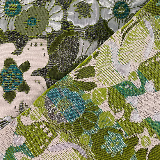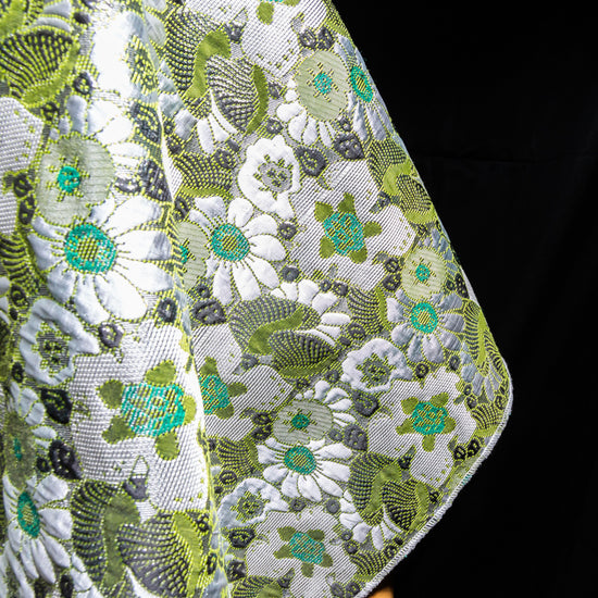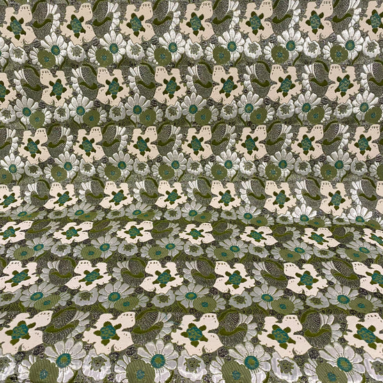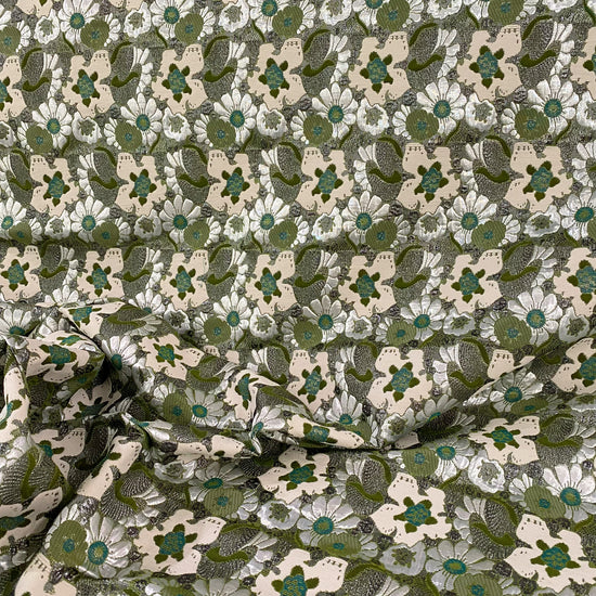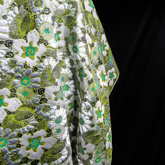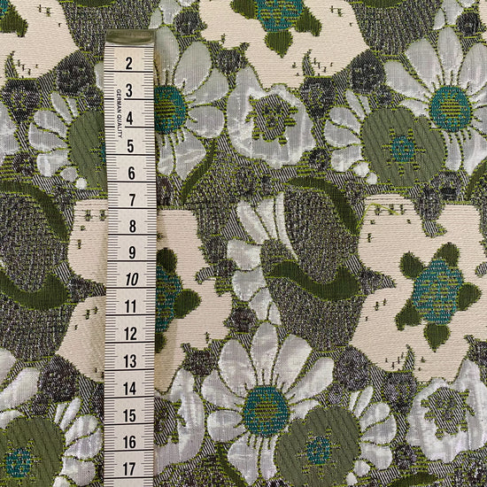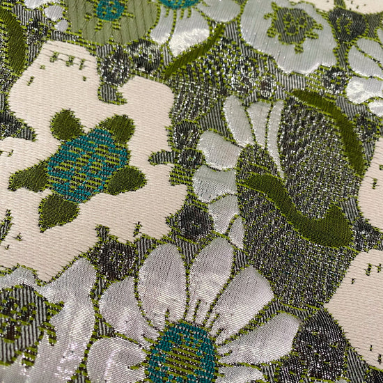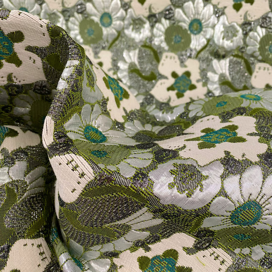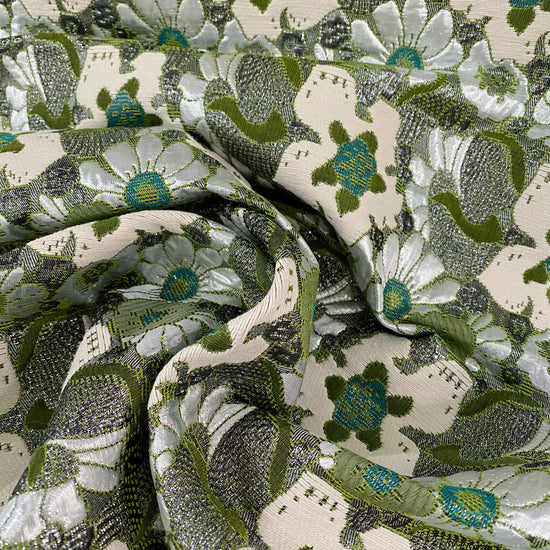 Cotton-polyester blend brocade in Ivory/Olive/Turquoise/Silver. This heavyweight fabric has a tight brocade weave - featuring floral motifs with metallic accents, and a ridged handle. It has a highly structured drape, opaque coverage, and no give.