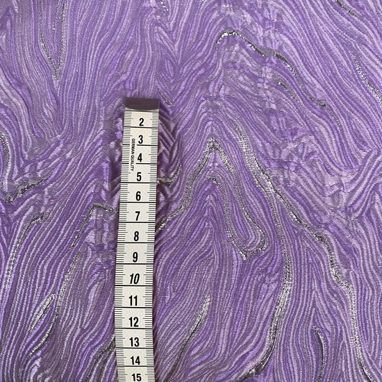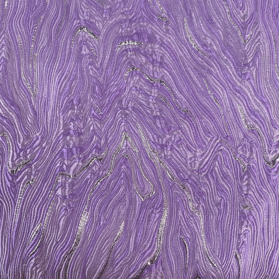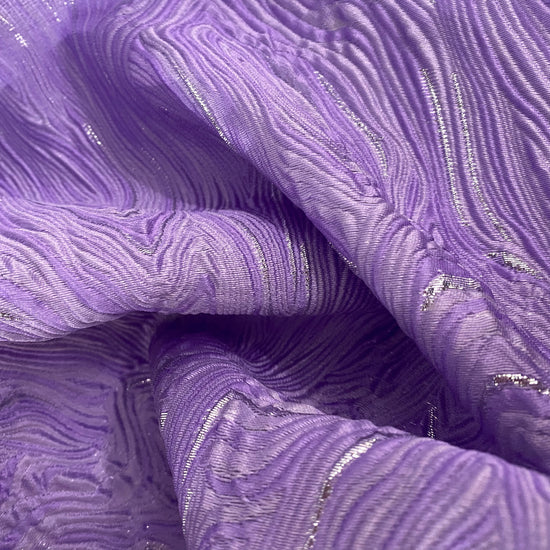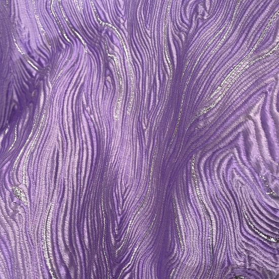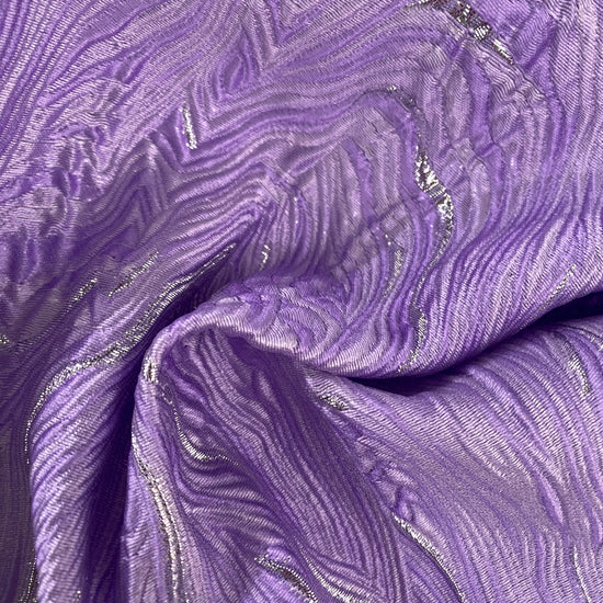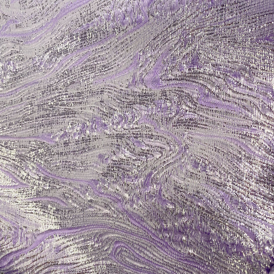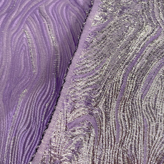 A light to medium weight, opaque, brocade with a metallic textured handle and firm, structured drape and no stretch.