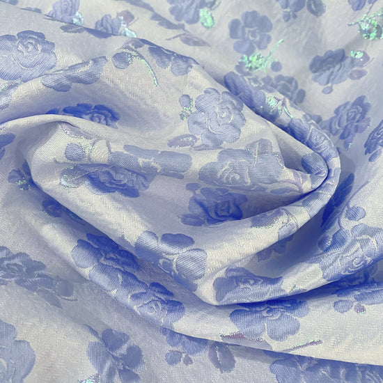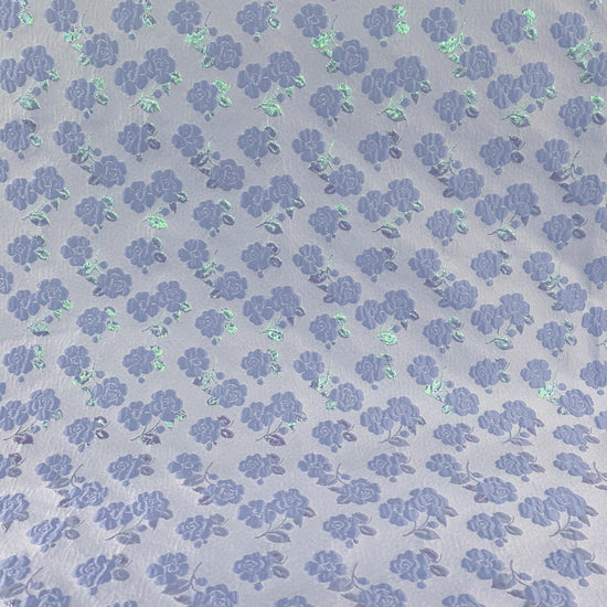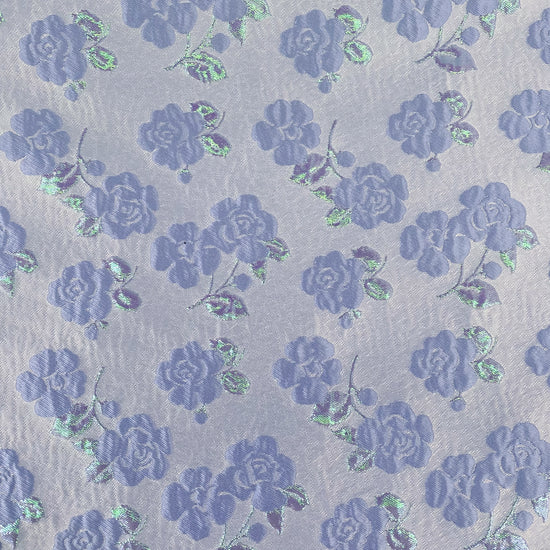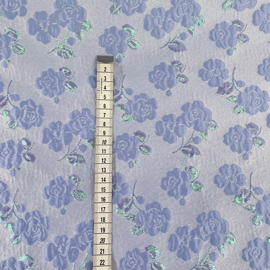 A structured drape, powder blue/mint floral brocade with mint metallic leaves with a metallic, firm handle.