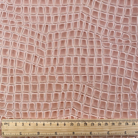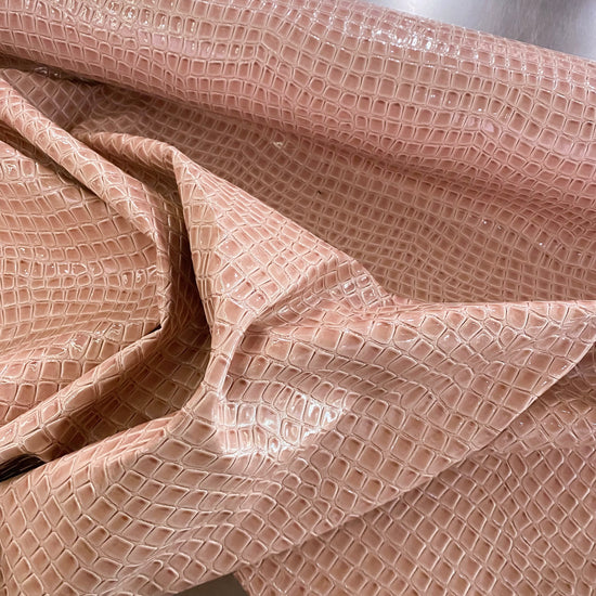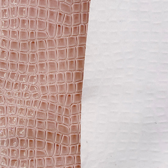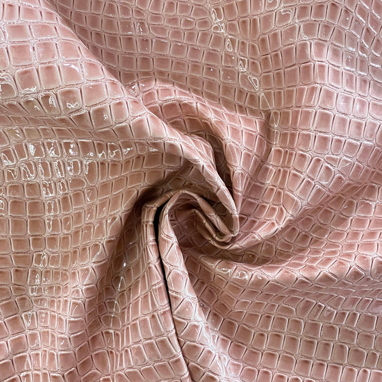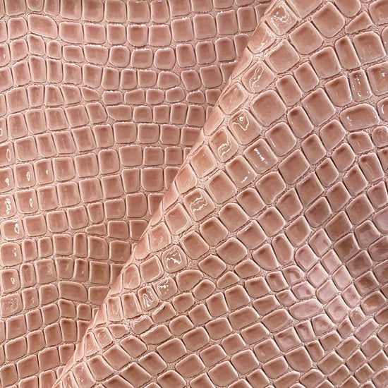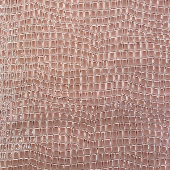 Patent Crocodile Faux Leather in Light Coral. This heavy weight faux leather has an embossed crocodile motif with a glossy patent finish. Bonded to a non-woven backing, it has a stiff drape, opaque coverage, and no stretch.