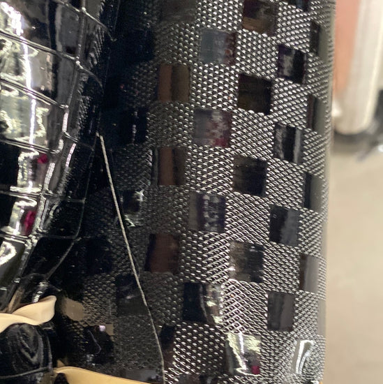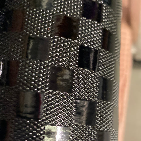 Patent Checkerboard Faux Leather in Black. This heavy weight faux leather has an embossed chockerboard motif with a glossy patent finish. Bonded to a non-woven backing, it has a stiff drape, opaque coverage, and no stretch.