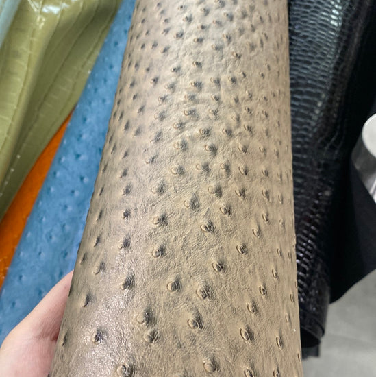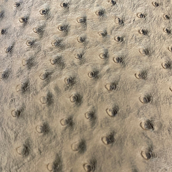 Faux Ostrich Leather in Umber. This heavy weight faux leather has an embossed ostrich motif with a natural sheen. Bonded to a non-woven backing, it has a stiff drape, opaque coverage, and no stretch.