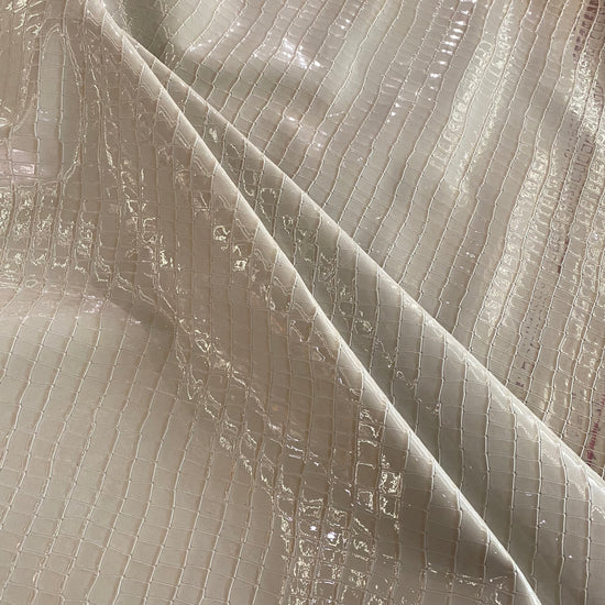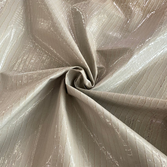 A medium weight, opaque faux leather with no give. It has a shiny, scaled appearance, smooth, textured handle and no drape.