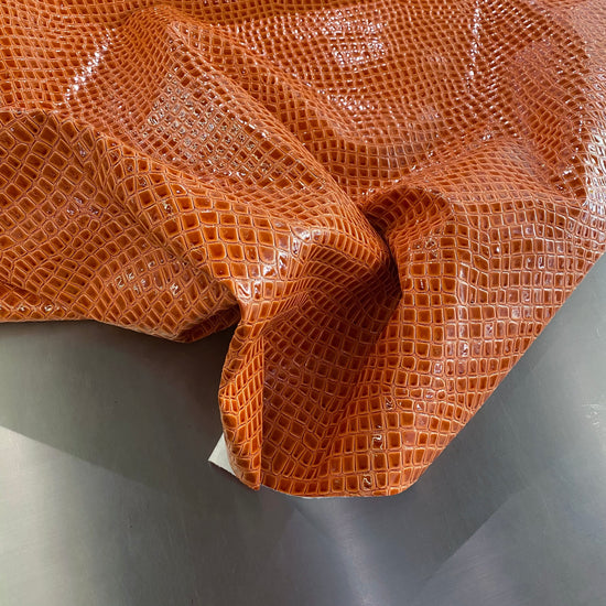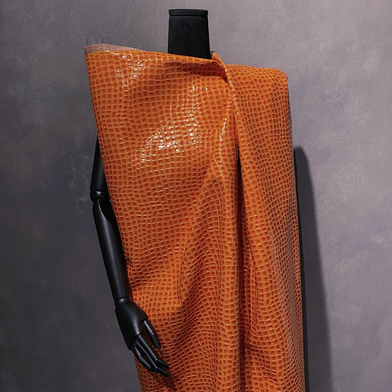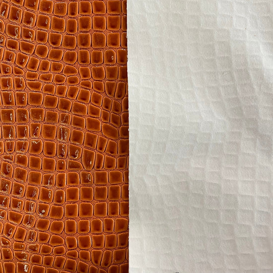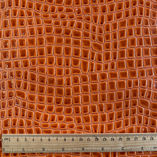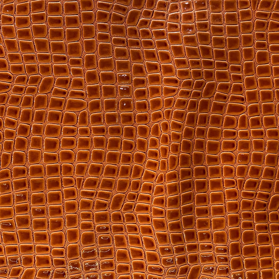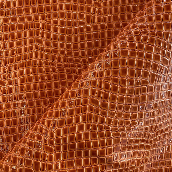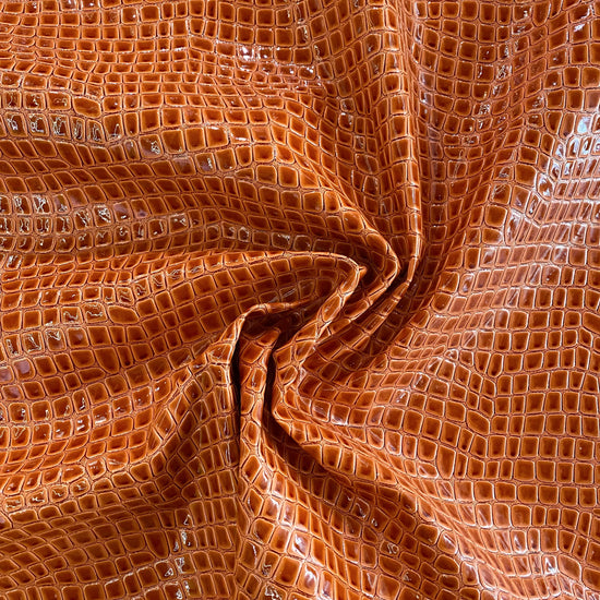 Patent alligator faux leather in burnt orange. This heavy weight faux leather has an embossed alligator motif with a glossy patent finish. Bonded to a non-woven backing, it has a stiff drape, opaque coverage, and no stretch.